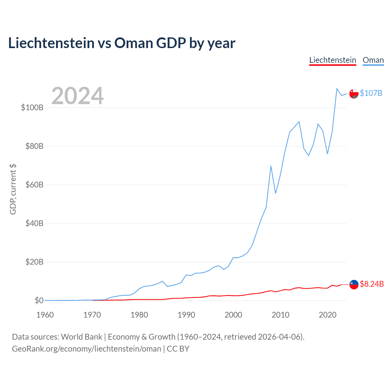 Liechtenstein has a GDP of $8.24B compared to $107B for Oman, ranking 156/197 and 70/197 by economy size, respectively.