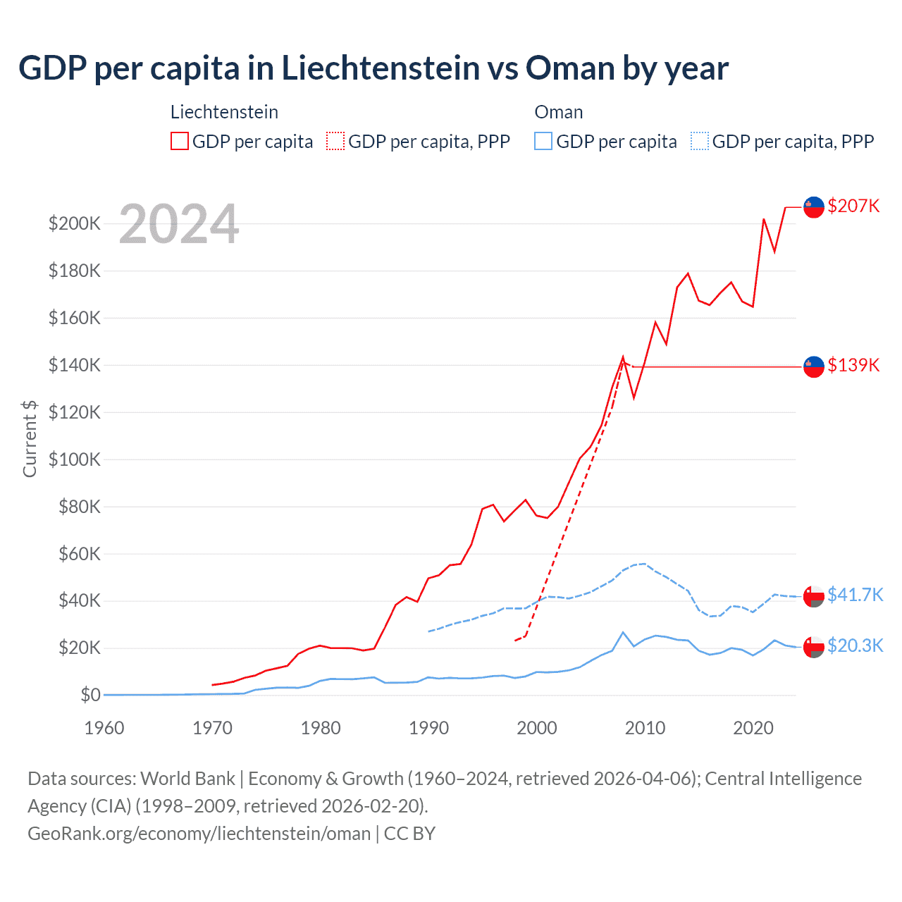 GDP per capita in Liechtenstein vs Oman by year