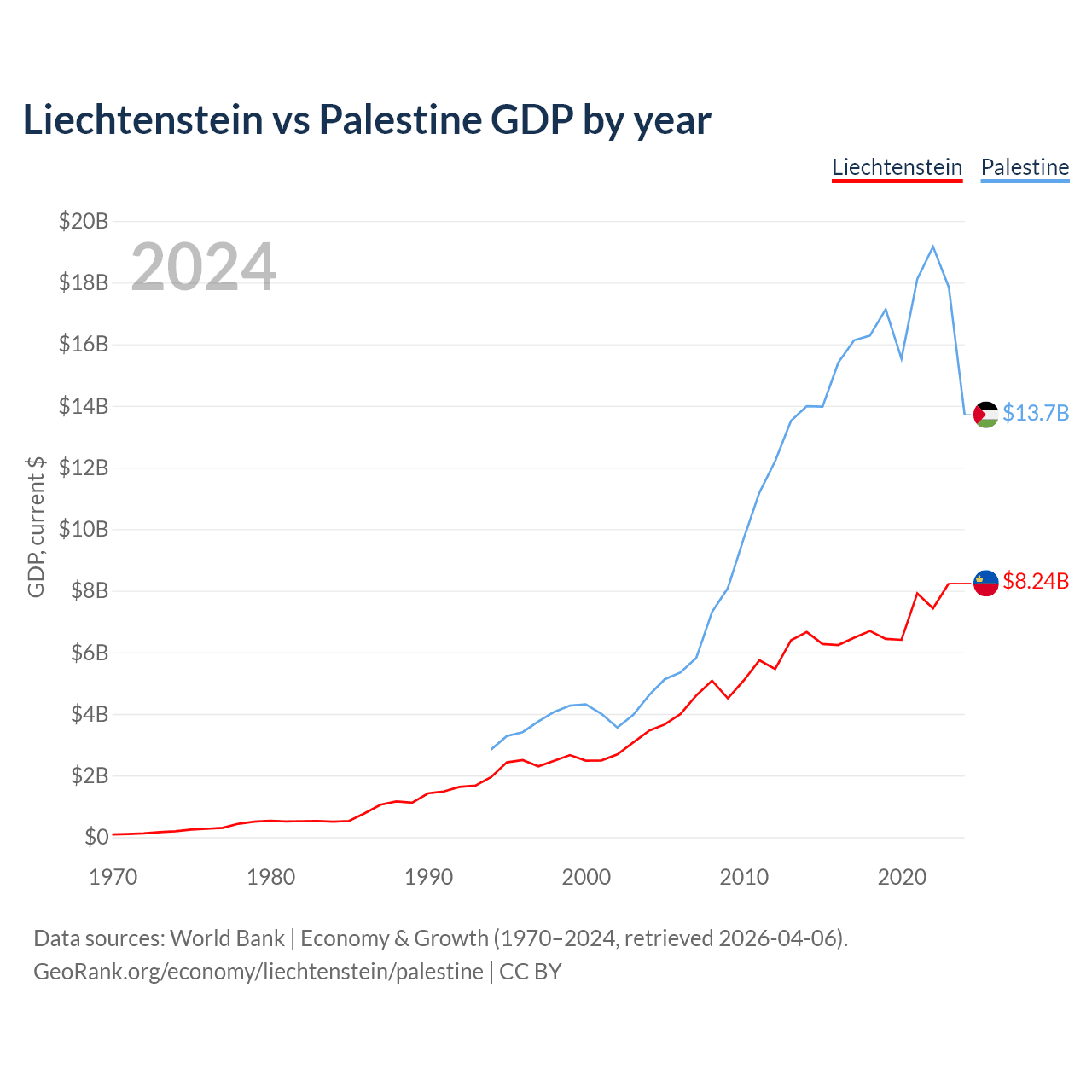 Liechtenstein has a GDP of $8.24B compared to $13.7B for Palestine, ranking 156/197 and 146/197 by economy size, respectively.