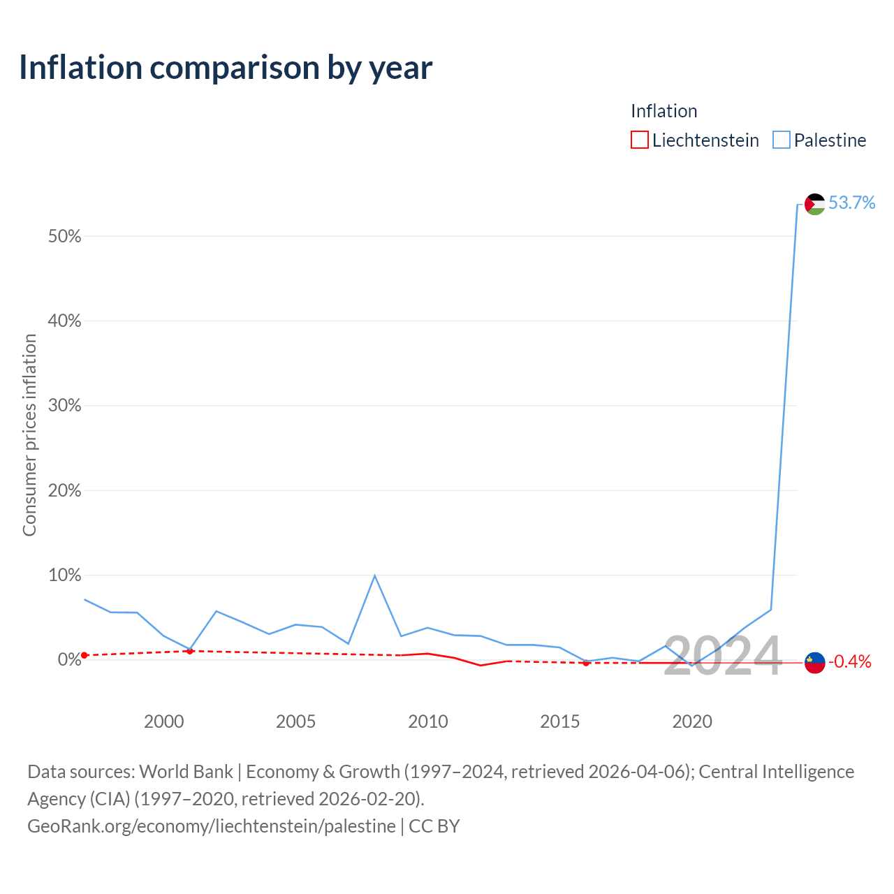 Over the past 24 years, Liechtenstein has recorded an average annual inflation rate of 0.04%, compared with 3.03% in Palestine. In 2020, inflation was -0.4% in Liechtenstein and 53.7% in Palestine.
