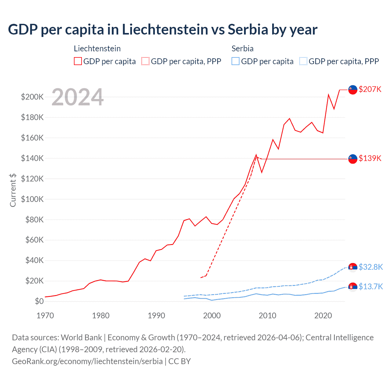 GDP per capita in Liechtenstein vs Serbia by year