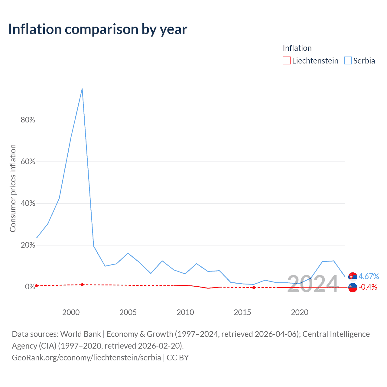 Over the past 24 years, Liechtenstein has recorded an average annual inflation rate of 0.04%, compared with 16.8% in Serbia. In 2020, inflation was -0.4% in Liechtenstein and 4.67% in Serbia.