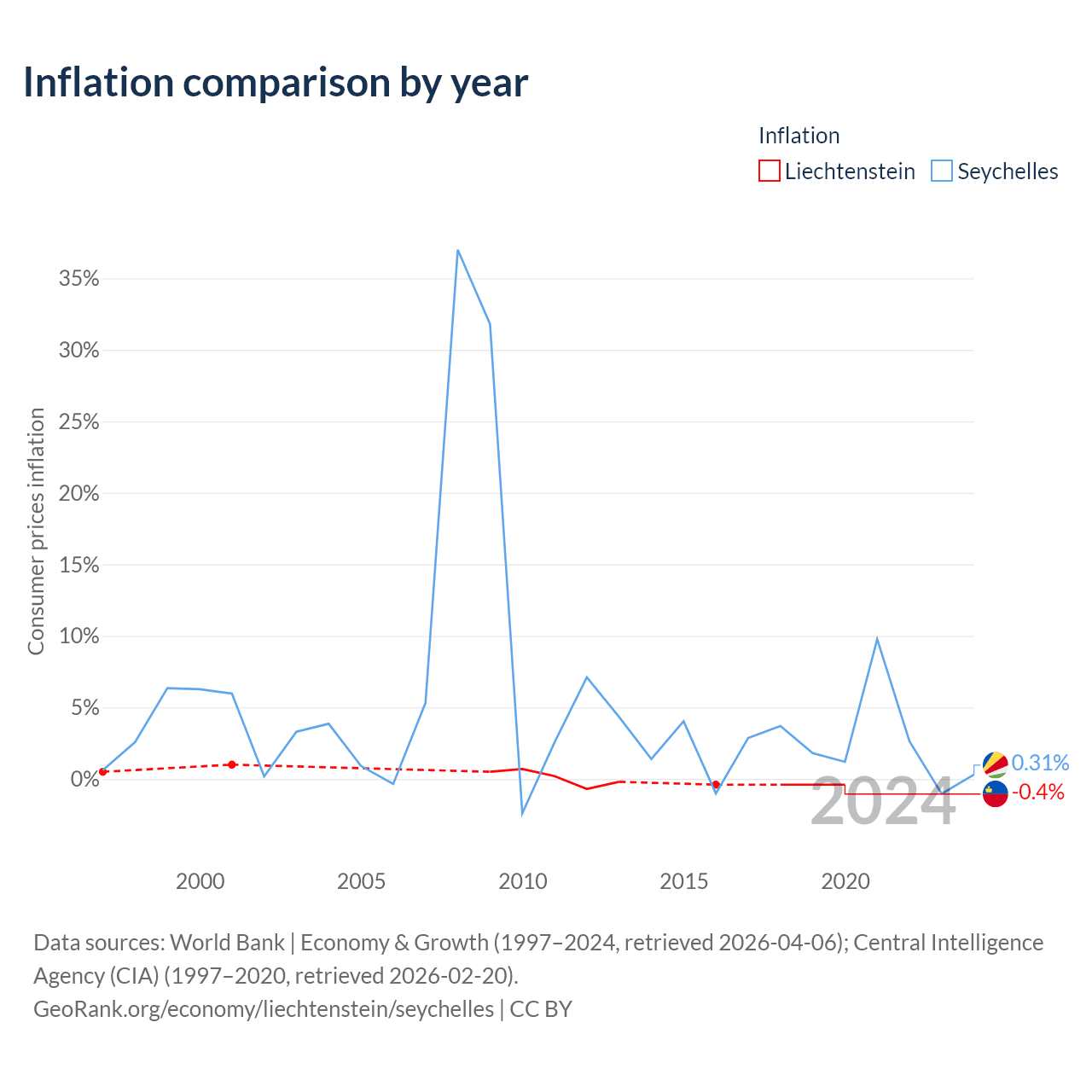 Over the past 24 years, Liechtenstein has recorded an average annual inflation rate of 0.04%, compared with 5.39% in the Seychelles. In 2020, inflation was -0.4% in Liechtenstein and 0.31% in the Seychelles.