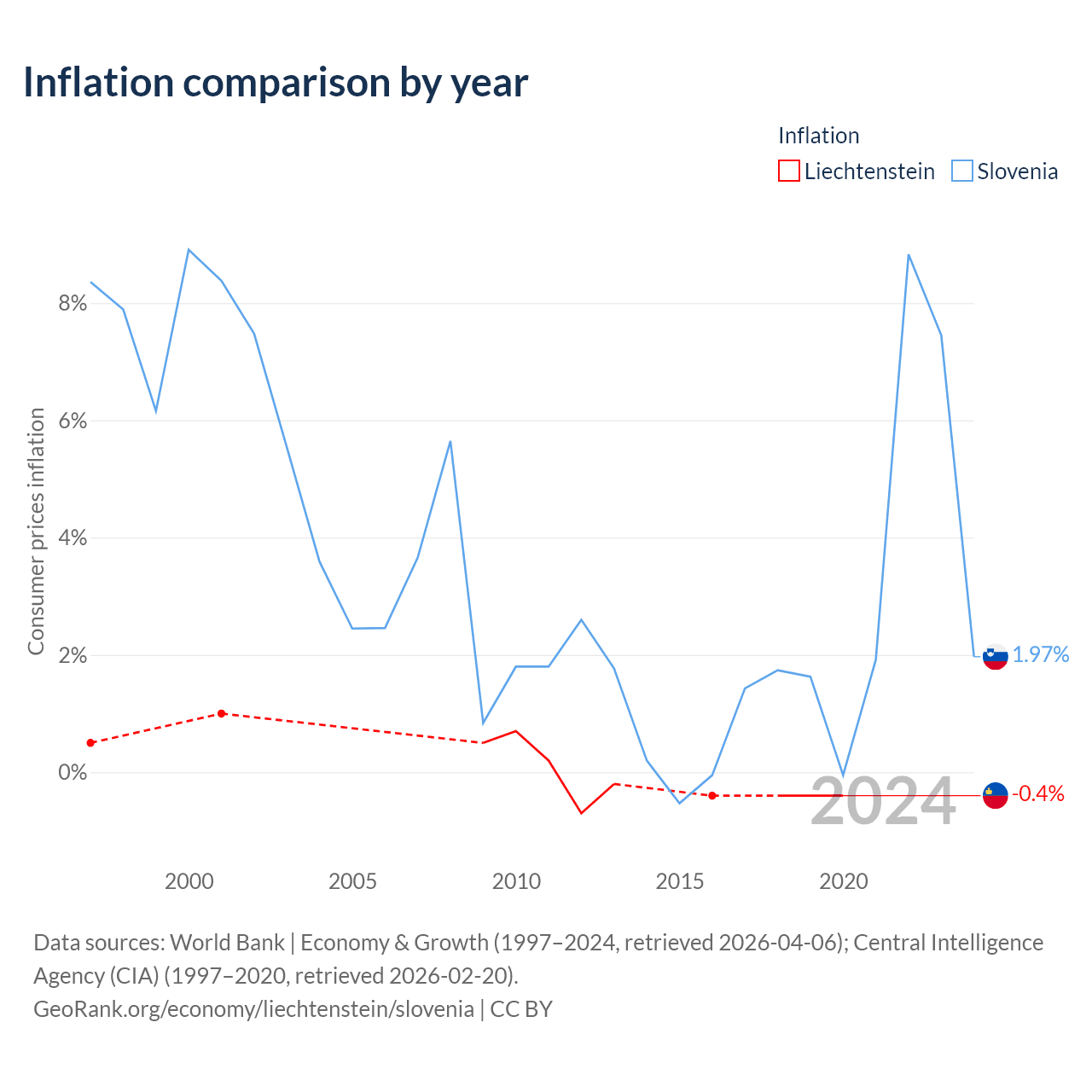 Over the past 24 years, Liechtenstein has recorded an average annual inflation rate of 0.04%, compared with 3.49% in Slovenia. In 2020, inflation was -0.4% in Liechtenstein and 1.97% in Slovenia.