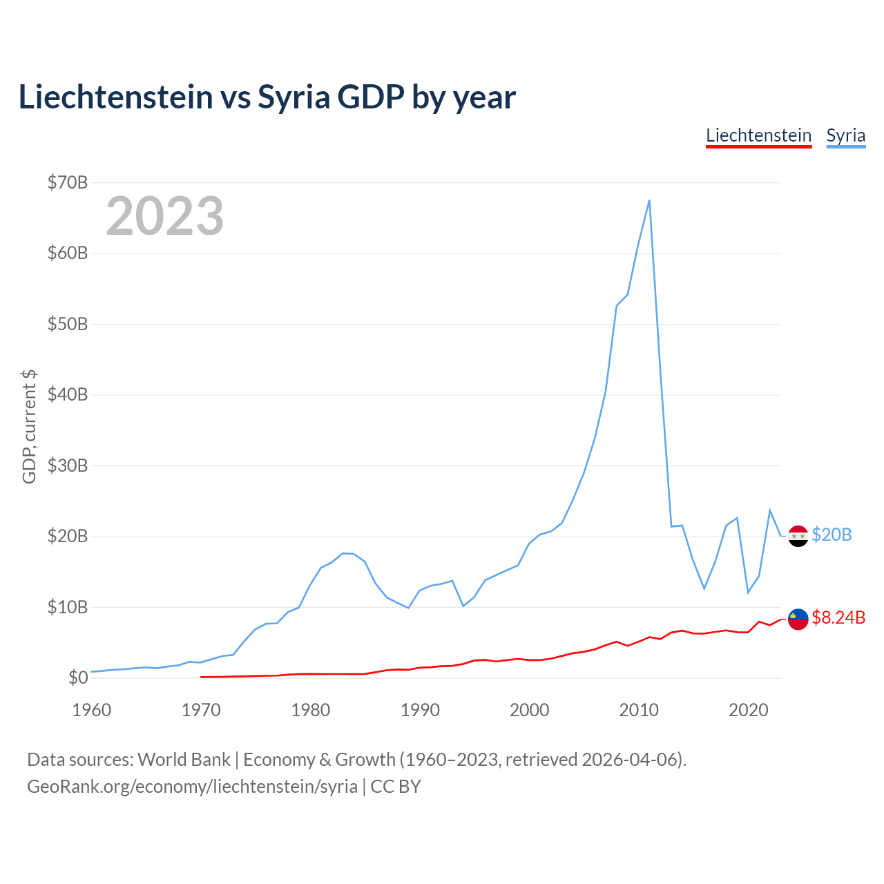 Liechtenstein has a GDP of $8.24B compared to $20B for Syria, ranking 156/197 and 129/197 by economy size, respectively.