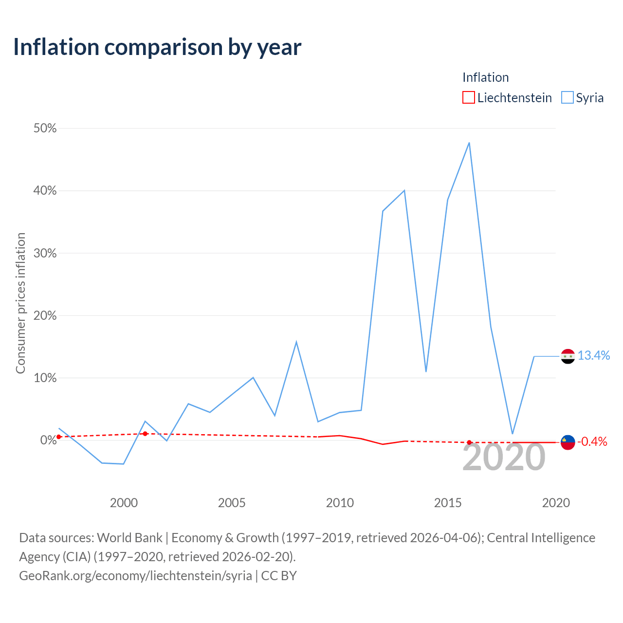 Over the past 23 years, Liechtenstein has recorded an average annual inflation rate of 0.08%, compared with 11.4% in Syria. In 2019, inflation was -0.4% in Liechtenstein and 13.4% in Syria.