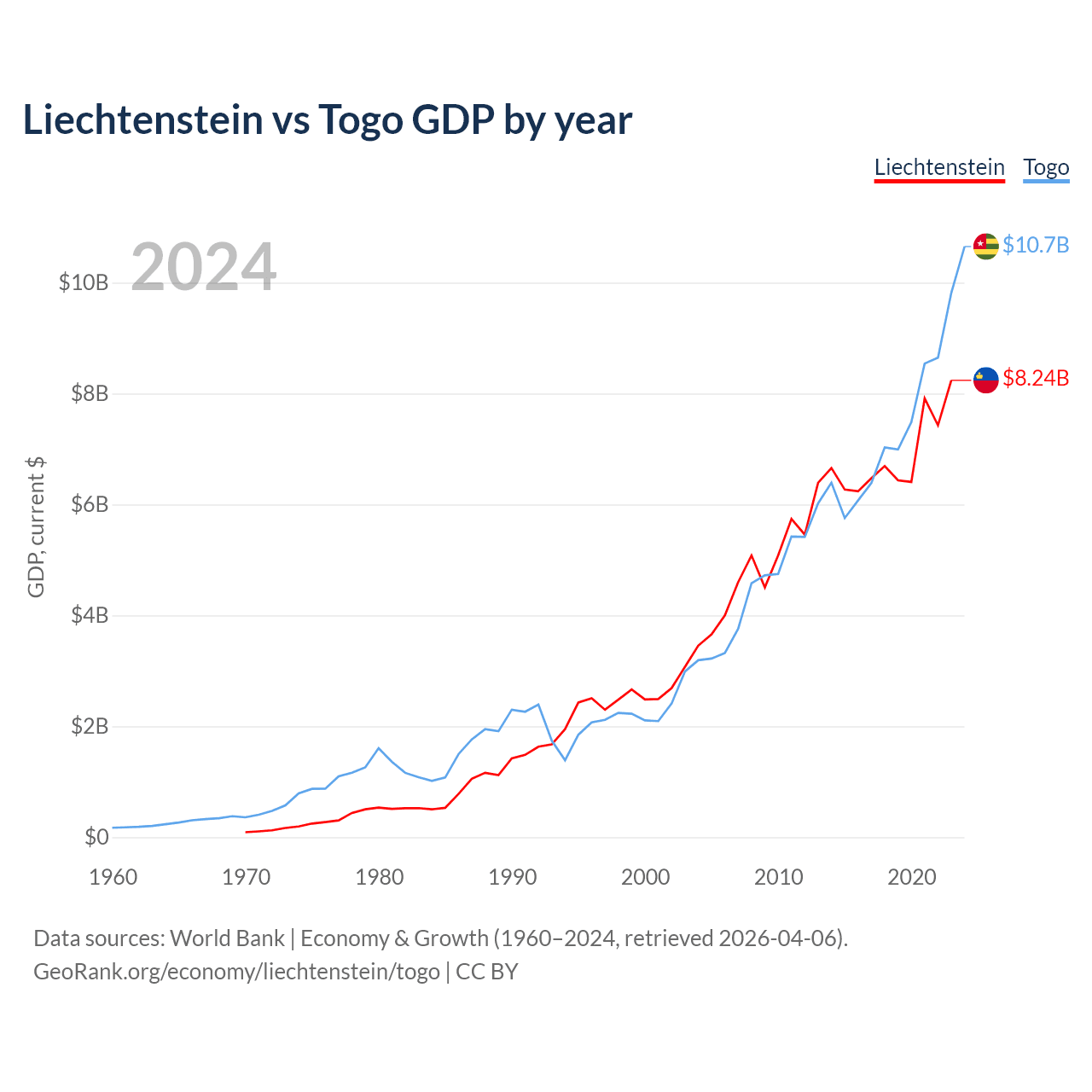 Liechtenstein has a GDP of $8.24B compared to $10.7B for Togo, ranking 156/197 and 154/197 by economy size, respectively.