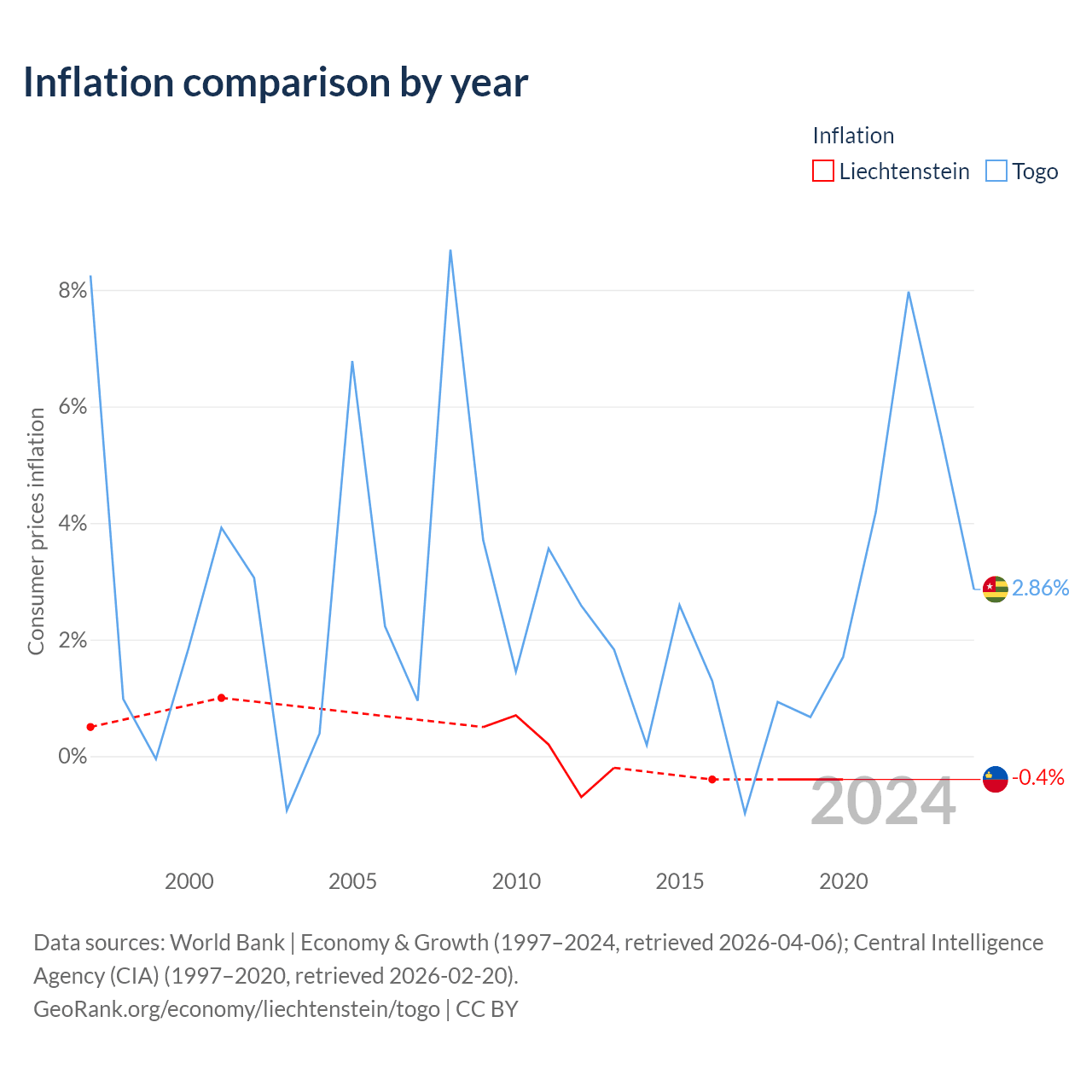 Over the past 24 years, Liechtenstein has recorded an average annual inflation rate of 0.04%, compared with 2.32% in Togo. In 2020, inflation was -0.4% in Liechtenstein and 2.86% in Togo.