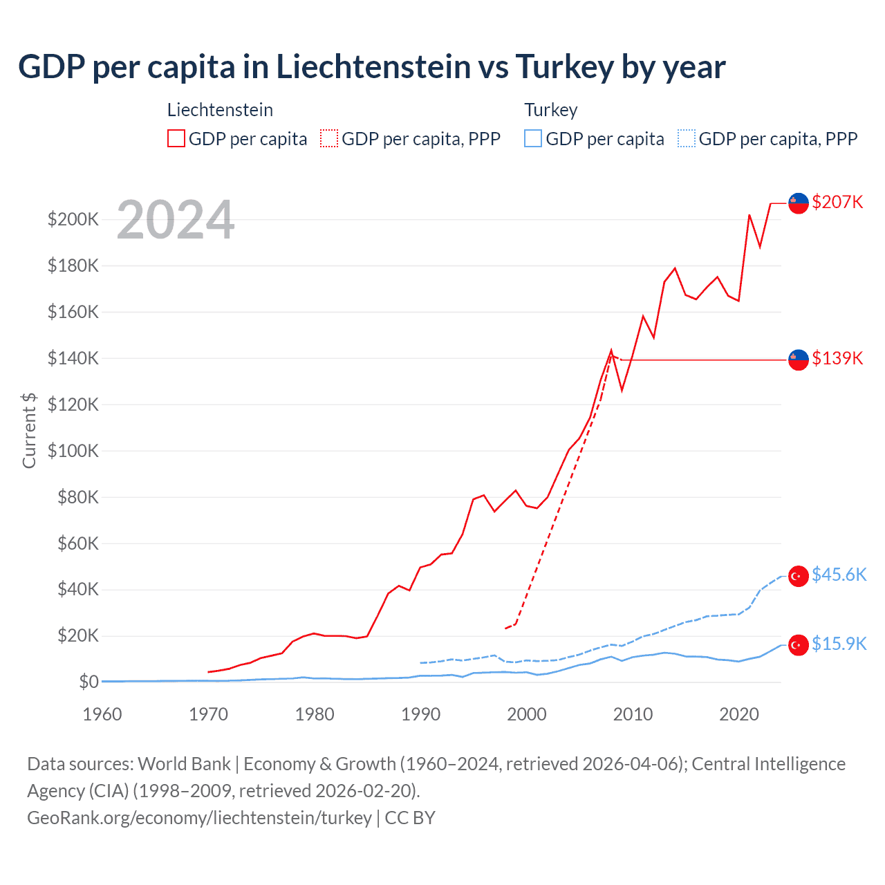 GDP per capita in Liechtenstein vs Turkey by year
