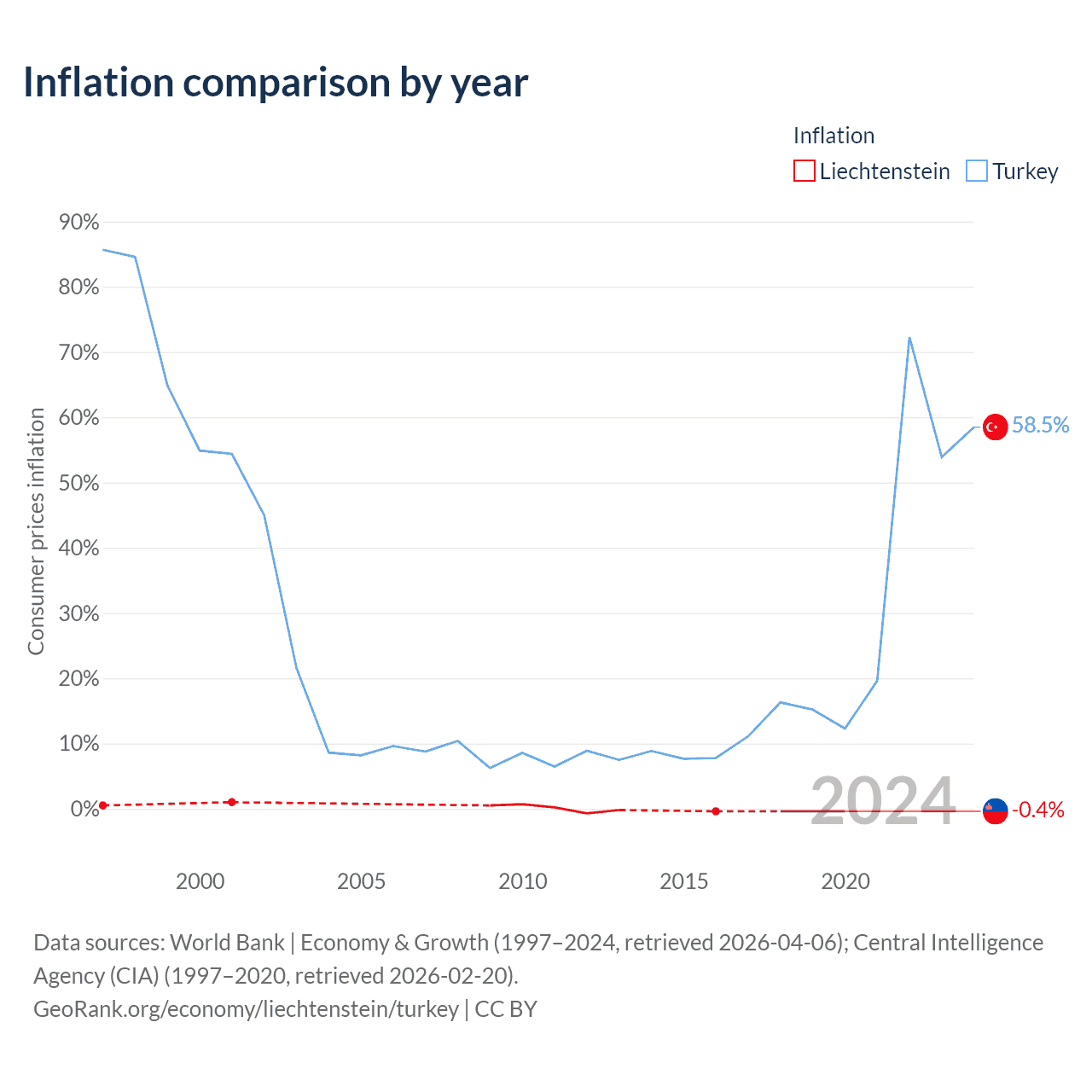 Over the past 24 years, Liechtenstein has recorded an average annual inflation rate of 0.04%, compared with 23.9% in Turkey. In 2020, inflation was -0.4% in Liechtenstein and 58.5% in Turkey.