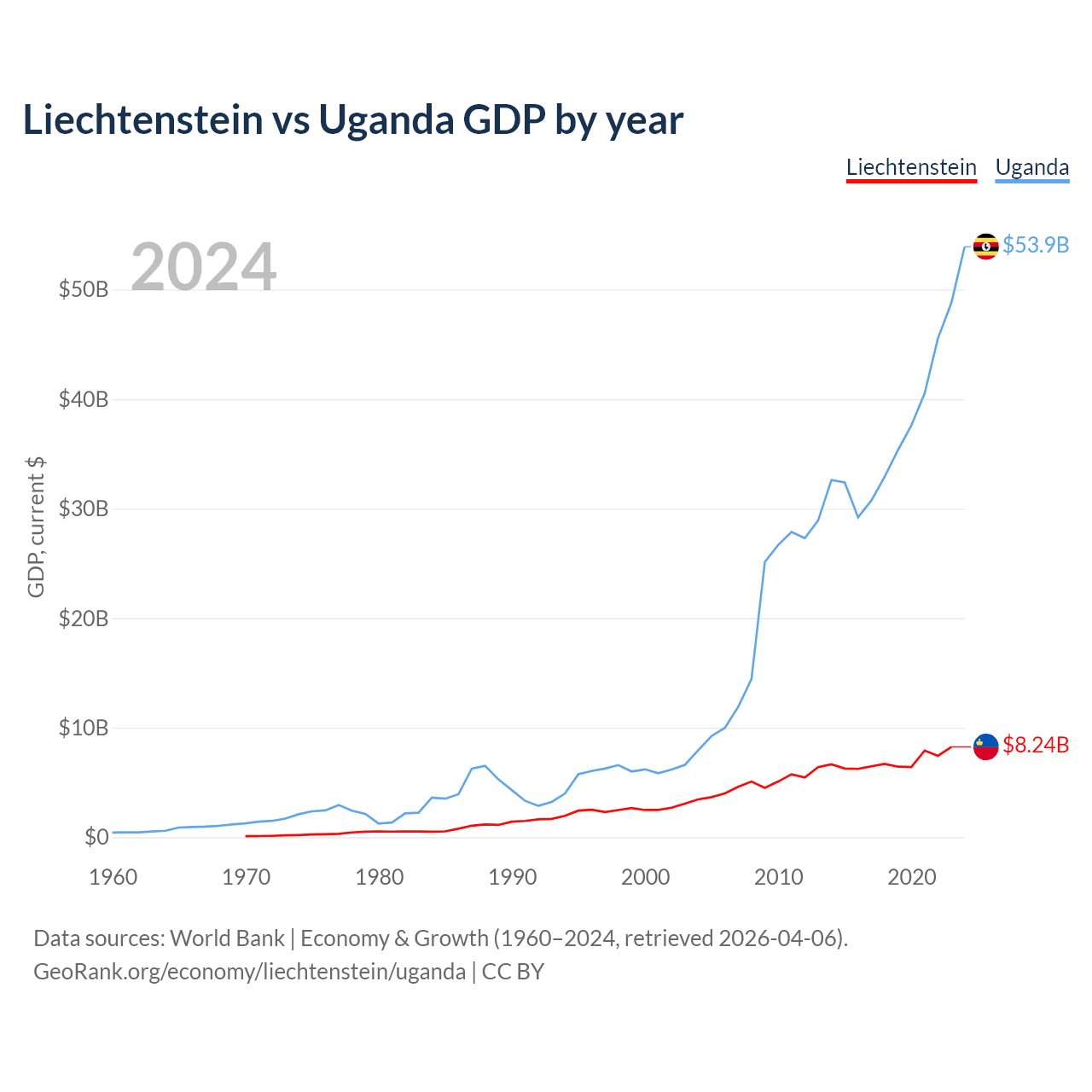 Liechtenstein has a GDP of $8.24B compared to $53.9B for Uganda, ranking 156/197 and 89/197 by economy size, respectively.