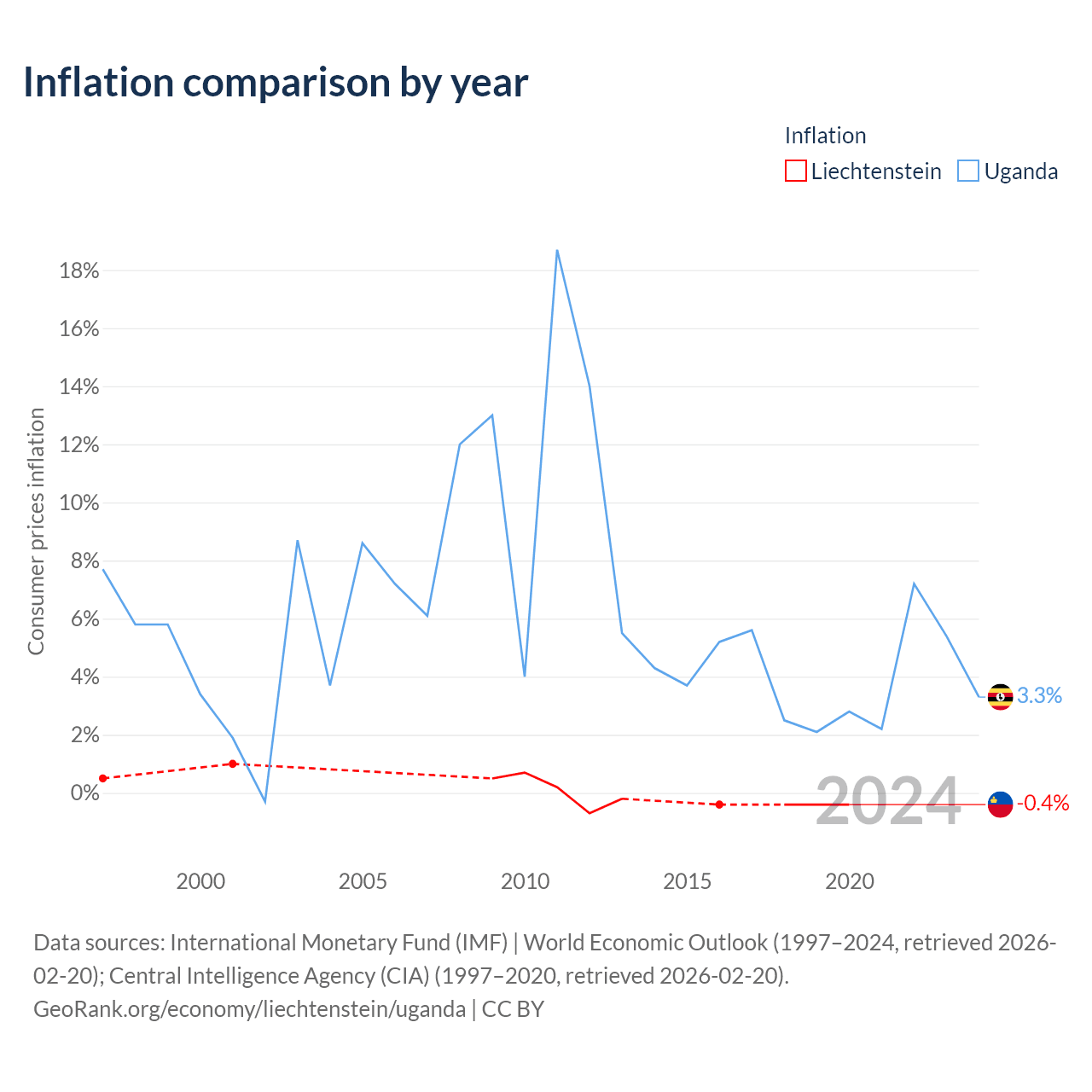 Over the past 24 years, Liechtenstein has recorded an average annual inflation rate of 0.04%, compared with 6.33% in Uganda. In 2020, inflation was -0.4% in Liechtenstein and 3.3% in Uganda.