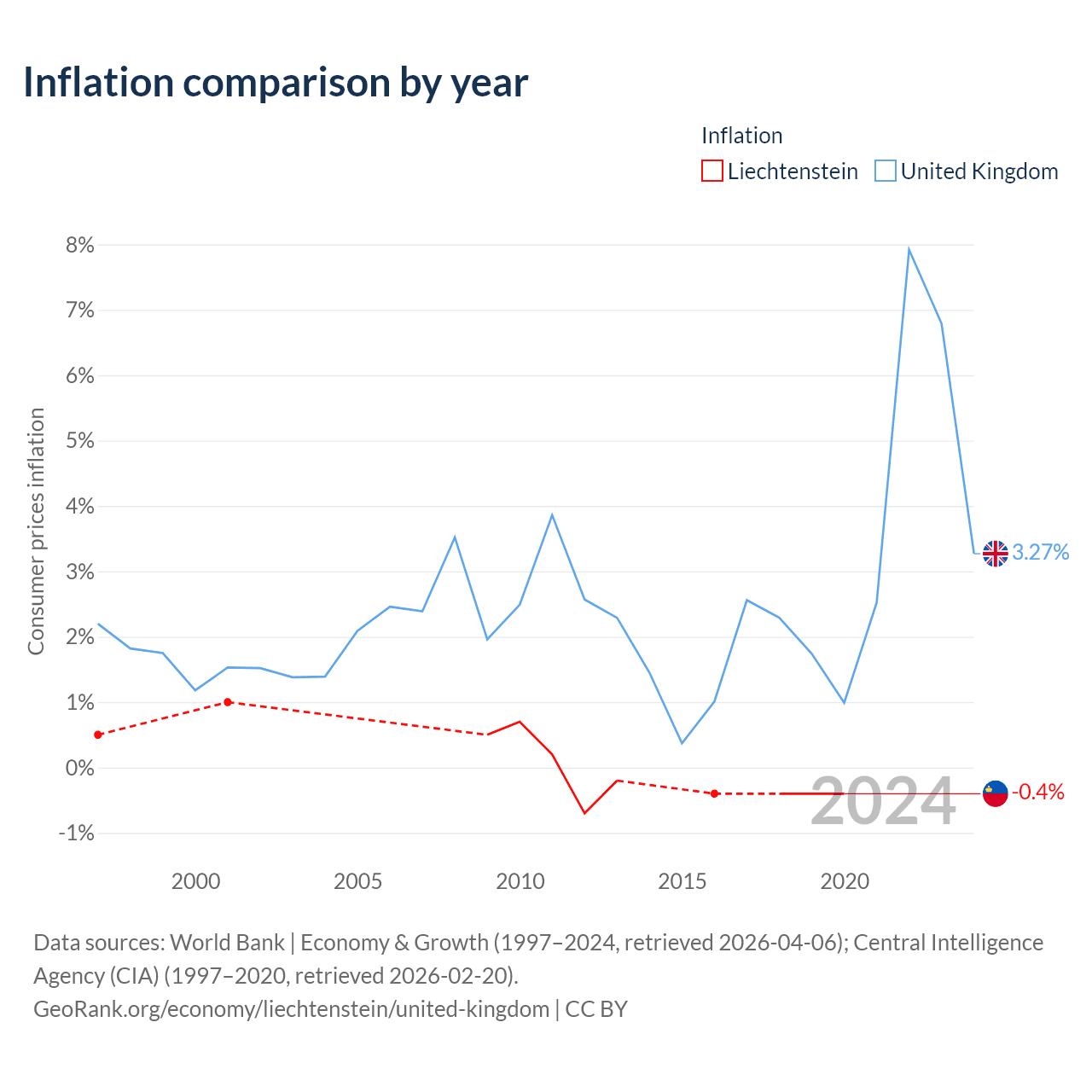 Over the past 24 years, Liechtenstein has recorded an average annual inflation rate of 0.04%, compared with 1.95% in the United Kingdom. In 2020, inflation was -0.4% in Liechtenstein and 3.27% in the United Kingdom.