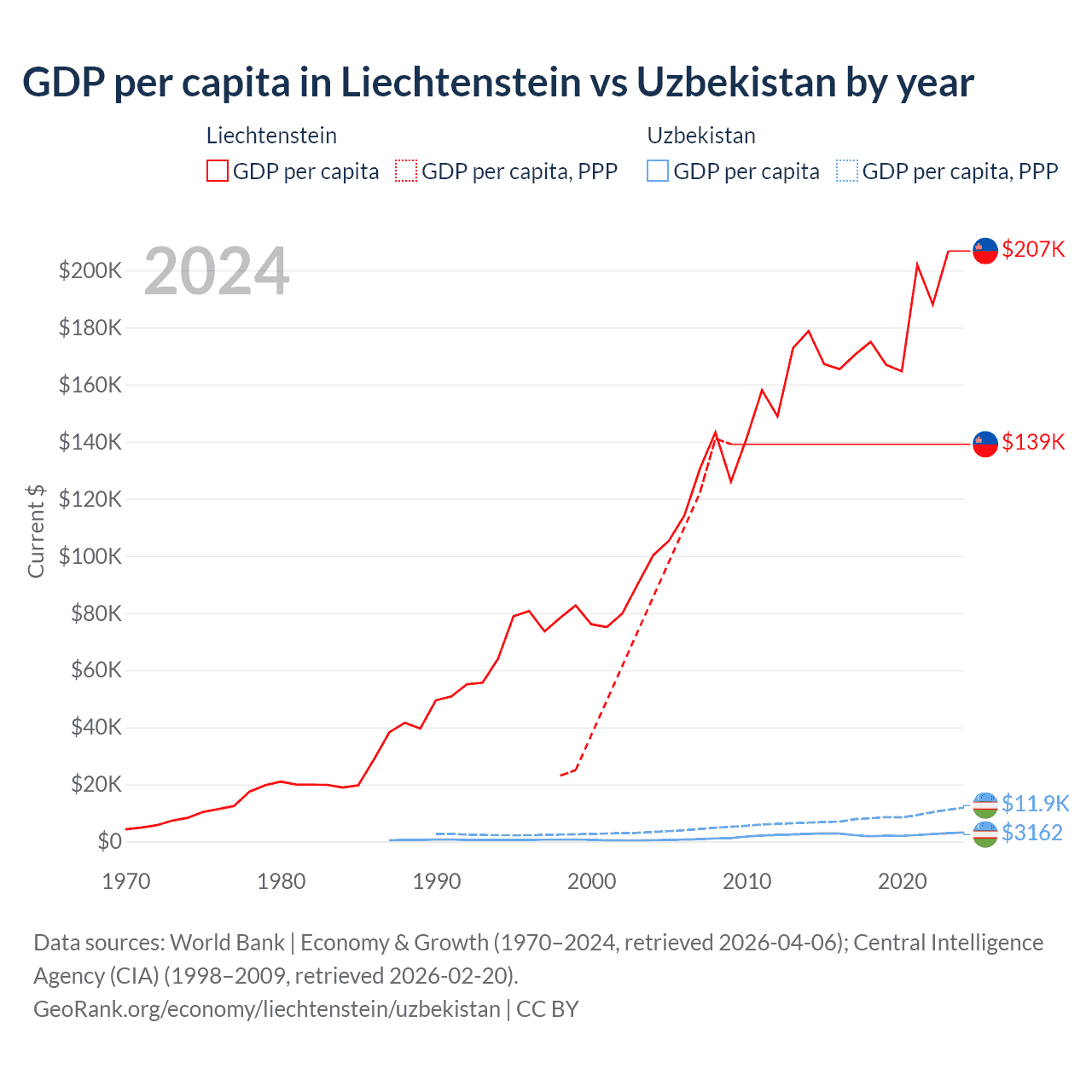 GDP per capita in Liechtenstein vs Uzbekistan by year