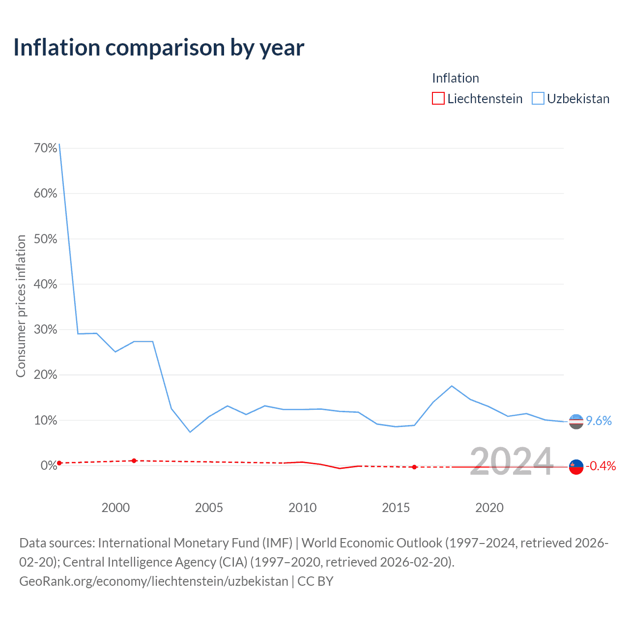 Over the past 24 years, Liechtenstein has recorded an average annual inflation rate of 0.04%, compared with 17.6% in Uzbekistan. In 2020, inflation was -0.4% in Liechtenstein and 9.6% in Uzbekistan.