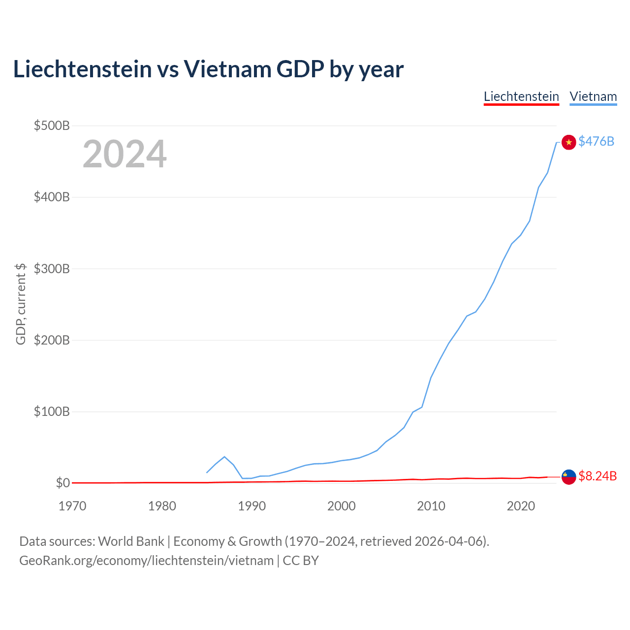 Liechtenstein has a GDP of $8.24B compared to $476B for Vietnam, ranking 156/197 and 33/197 by economy size, respectively.