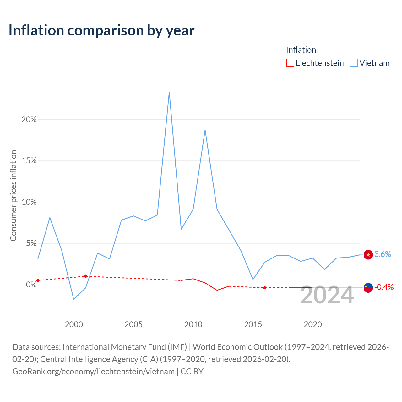 Over the past 24 years, Liechtenstein has recorded an average annual inflation rate of 0.04%, compared with 6.09% in Vietnam. In 2020, inflation was -0.4% in Liechtenstein and 3.6% in Vietnam.
