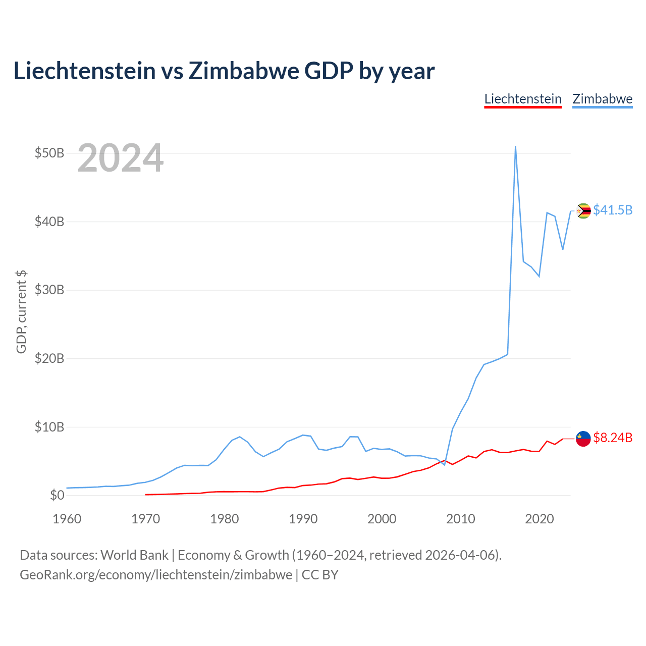 Liechtenstein has a GDP of $8.24B compared to $41.5B for Zimbabwe, ranking 156/197 and 102/197 by economy size, respectively.