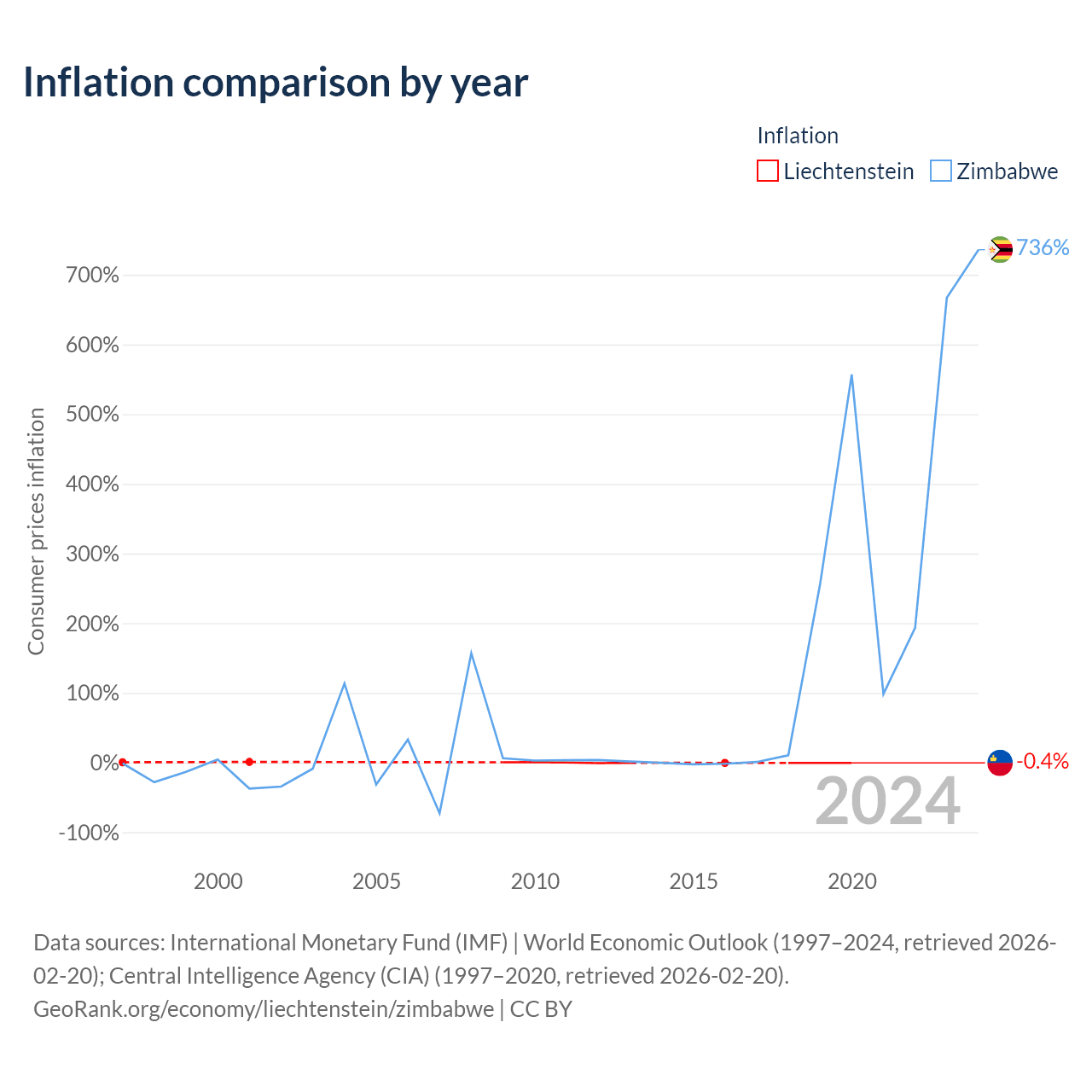 Over the past 24 years, Liechtenstein has recorded an average annual inflation rate of 0.04%, compared with 38.3% in Zimbabwe. In 2020, inflation was -0.4% in Liechtenstein and 736% in Zimbabwe.