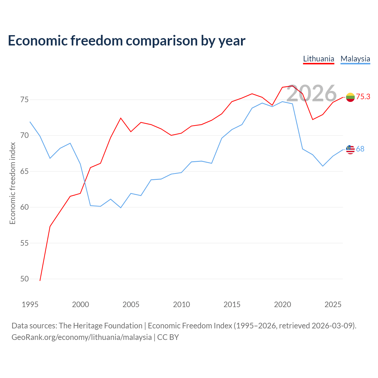 The Economic Freedom Index for Lithuania is 75.3, ranking 18/197, compared to 68 for Malaysia, ranking 51/197. The chart above displays a comparison of annual changes in economic freedom indexes.