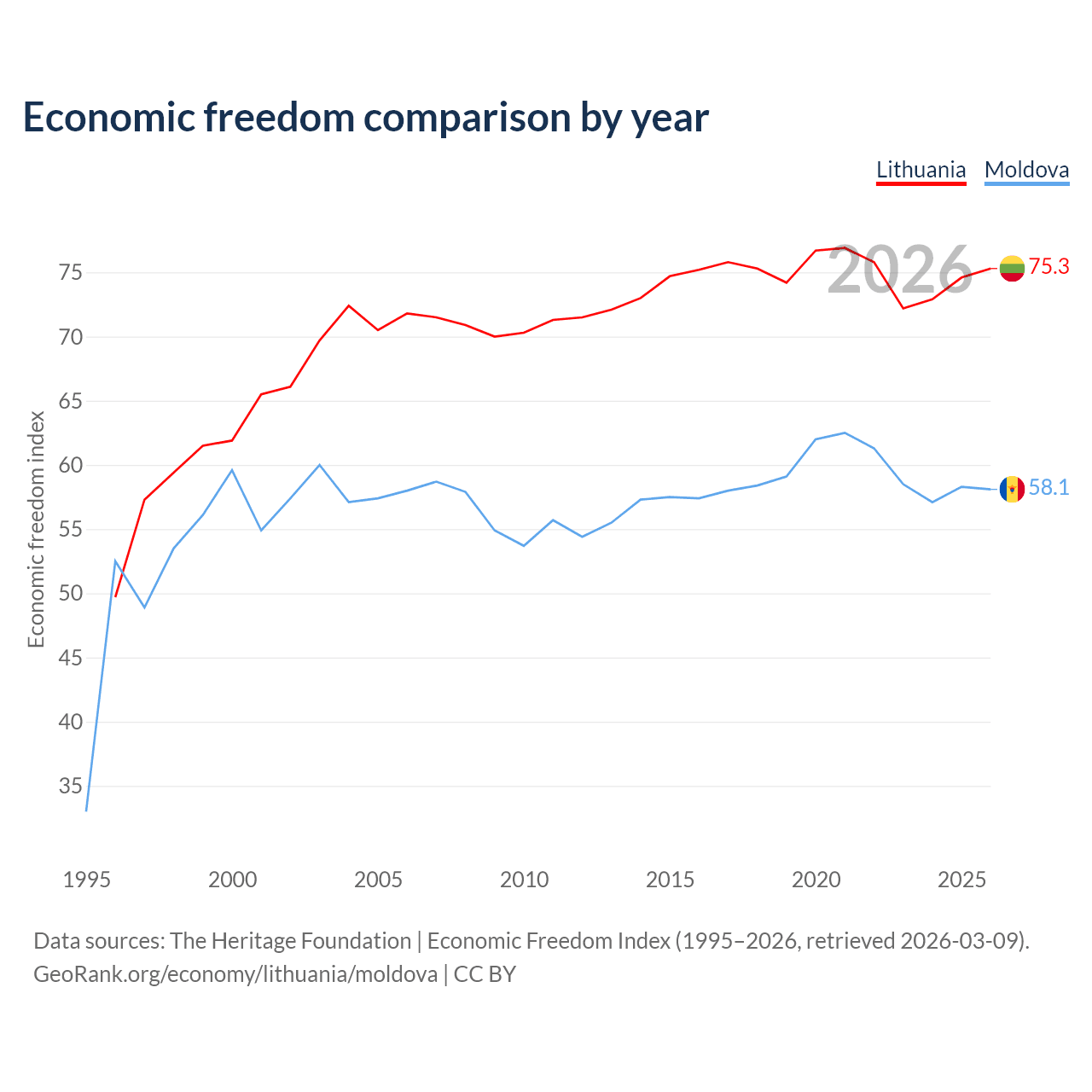 The Economic Freedom Index for Lithuania is 75.3, ranking 18/197, compared to 58.1 for Moldova, ranking 112/197. The chart above displays a comparison of annual changes in economic freedom indexes.
