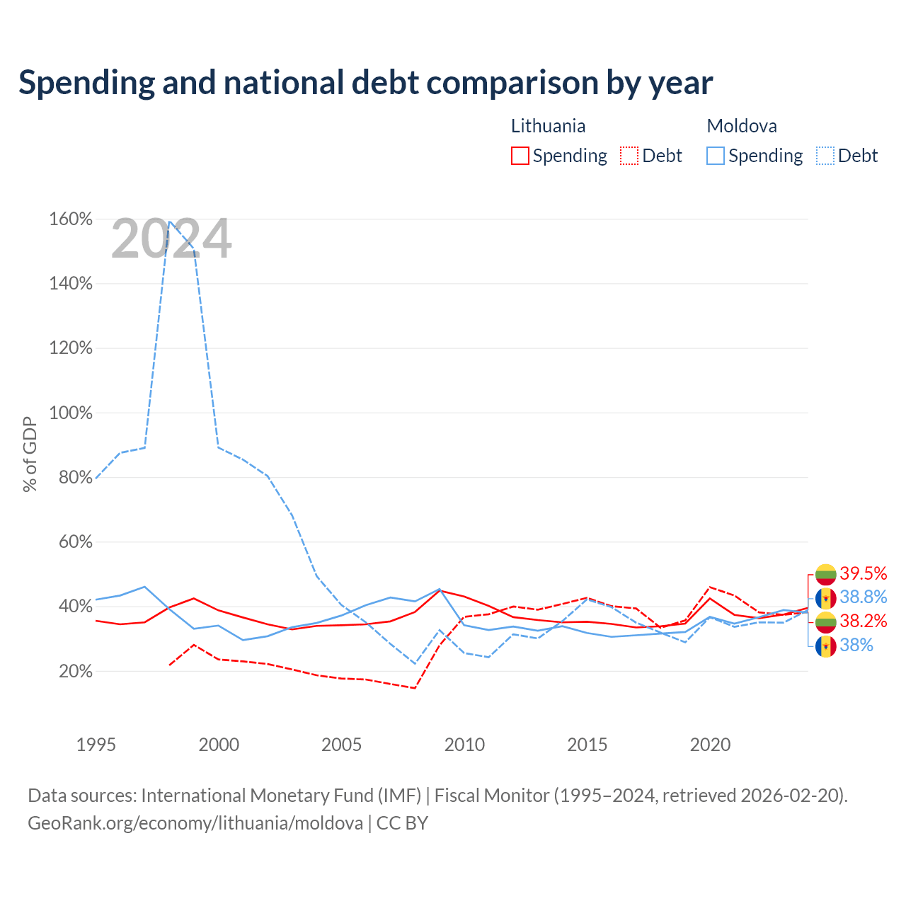 Lithuania has $32.4B in government debt (38.2% of GDP), compared to $7.06B (38.8% of GDP) in Moldova.
