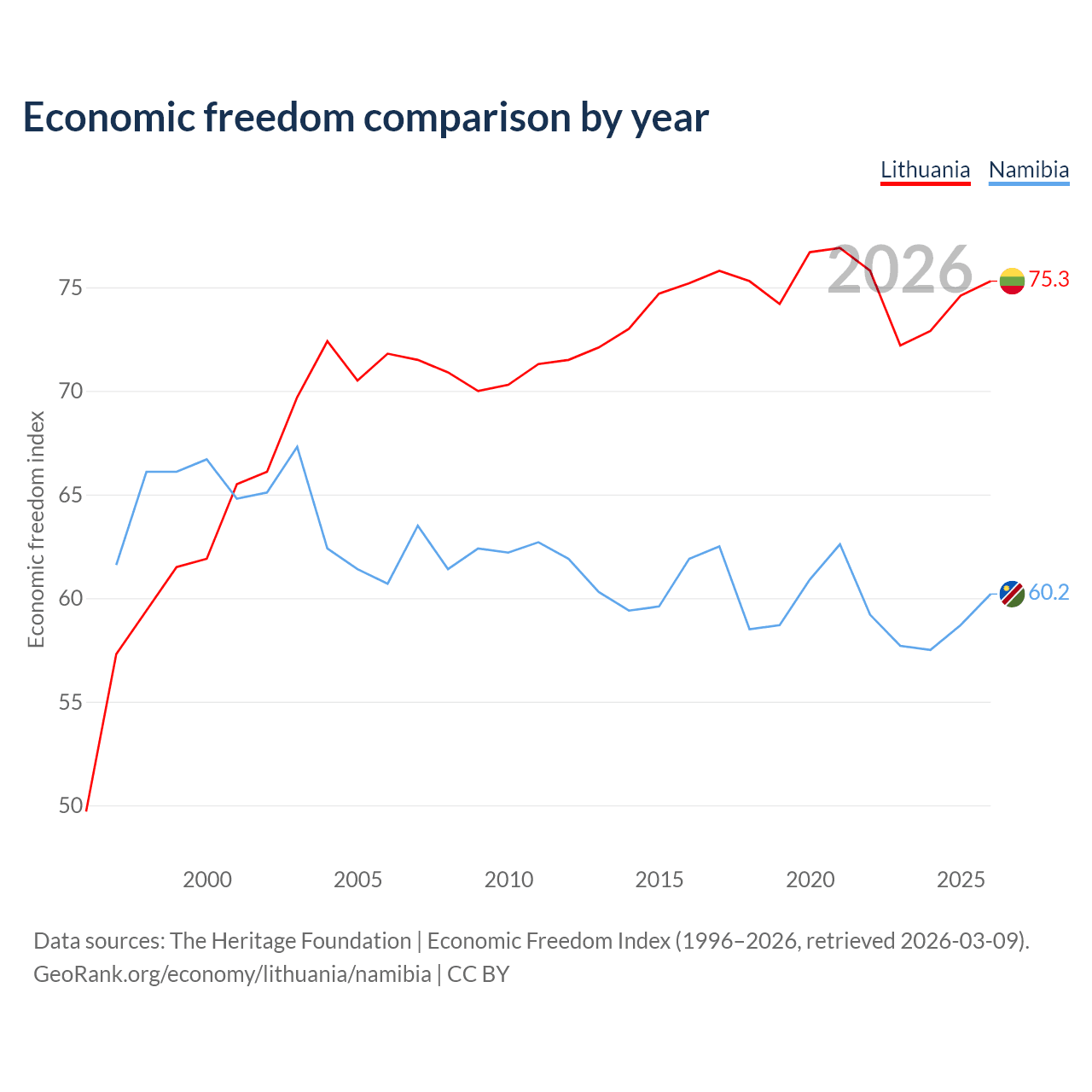 The Economic Freedom Index for Lithuania is 75.3, ranking 18/197, compared to 60.2 for Namibia, ranking 95/197. The chart above displays a comparison of annual changes in economic freedom indexes.