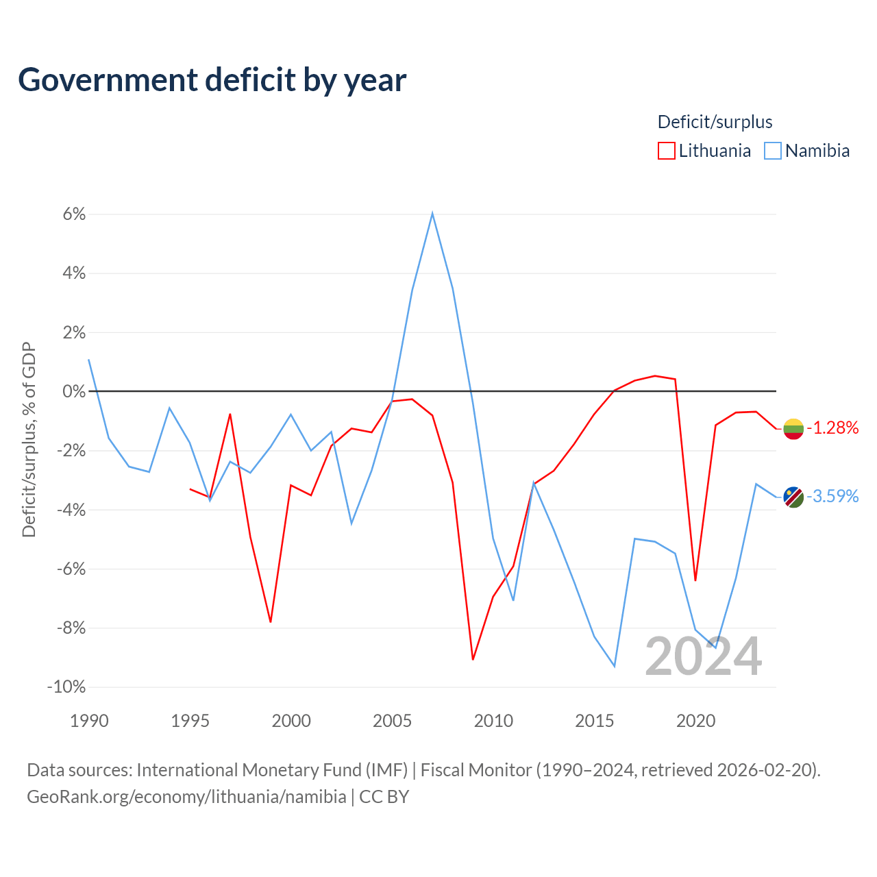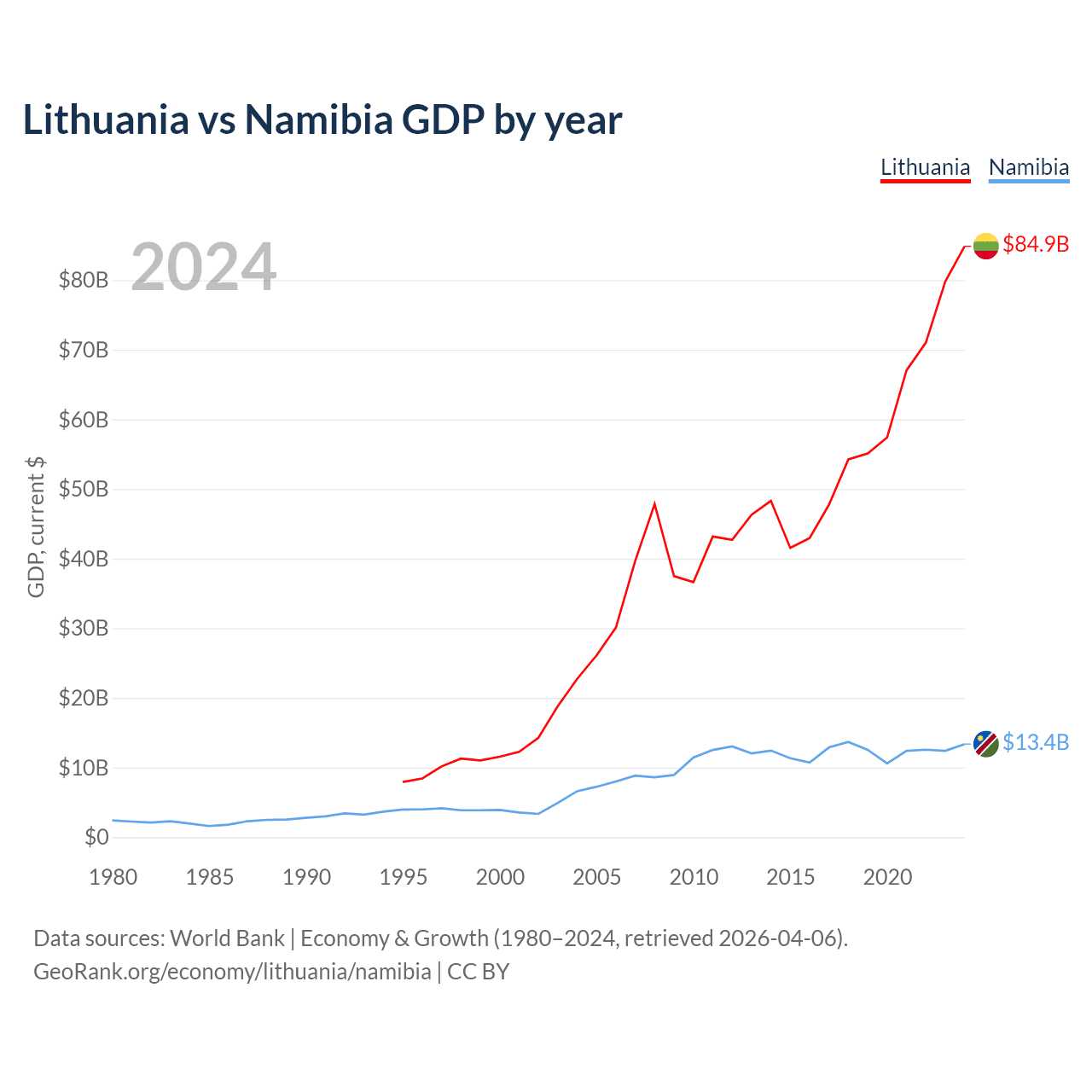 Lithuania has a GDP of $84.9B compared to $13.4B for Namibia, ranking 79/197 and 147/197 by economy size, respectively.
