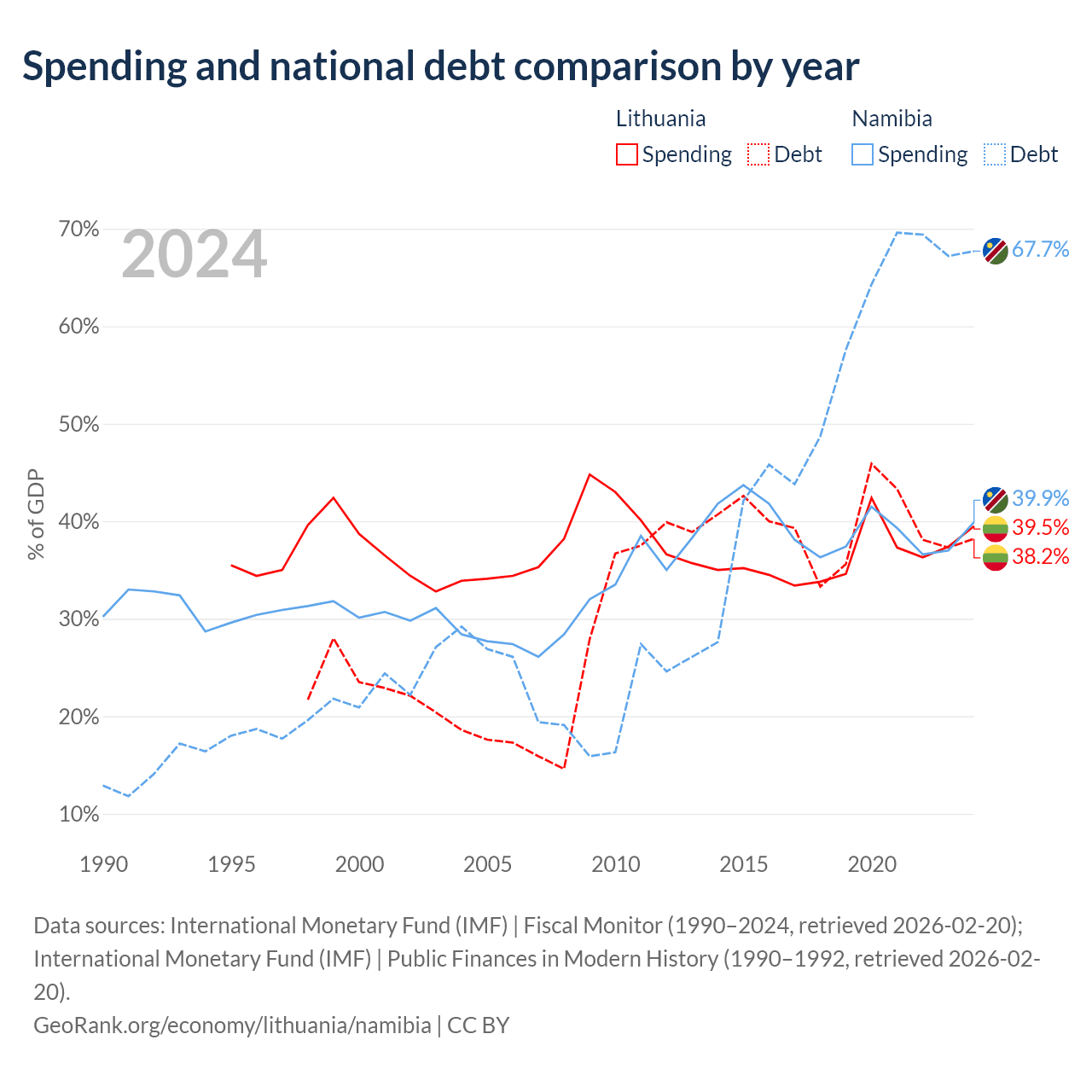 Lithuania has $32.4B in government debt (38.2% of GDP), compared to $9.05B (67.7% of GDP) in Namibia.