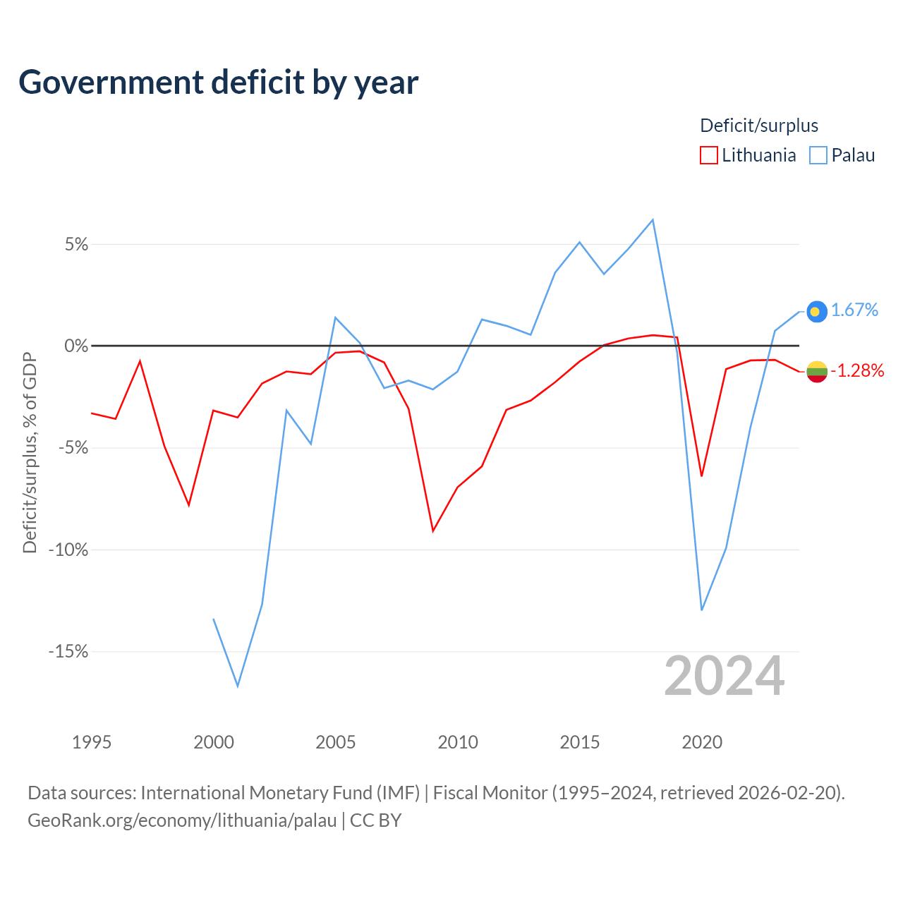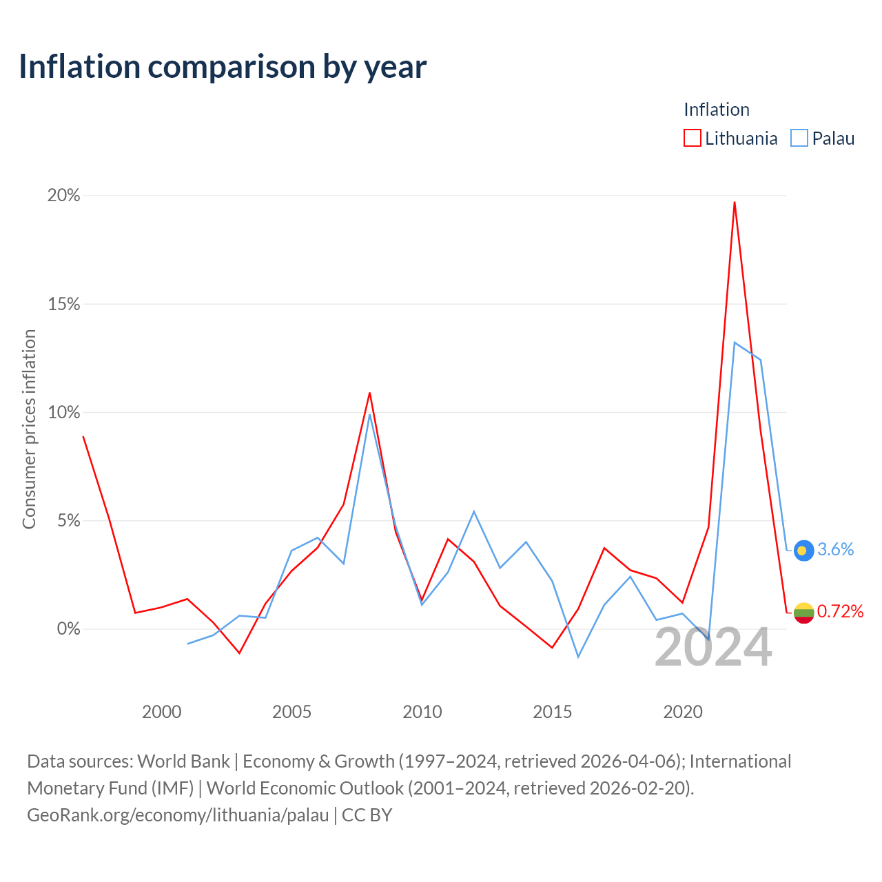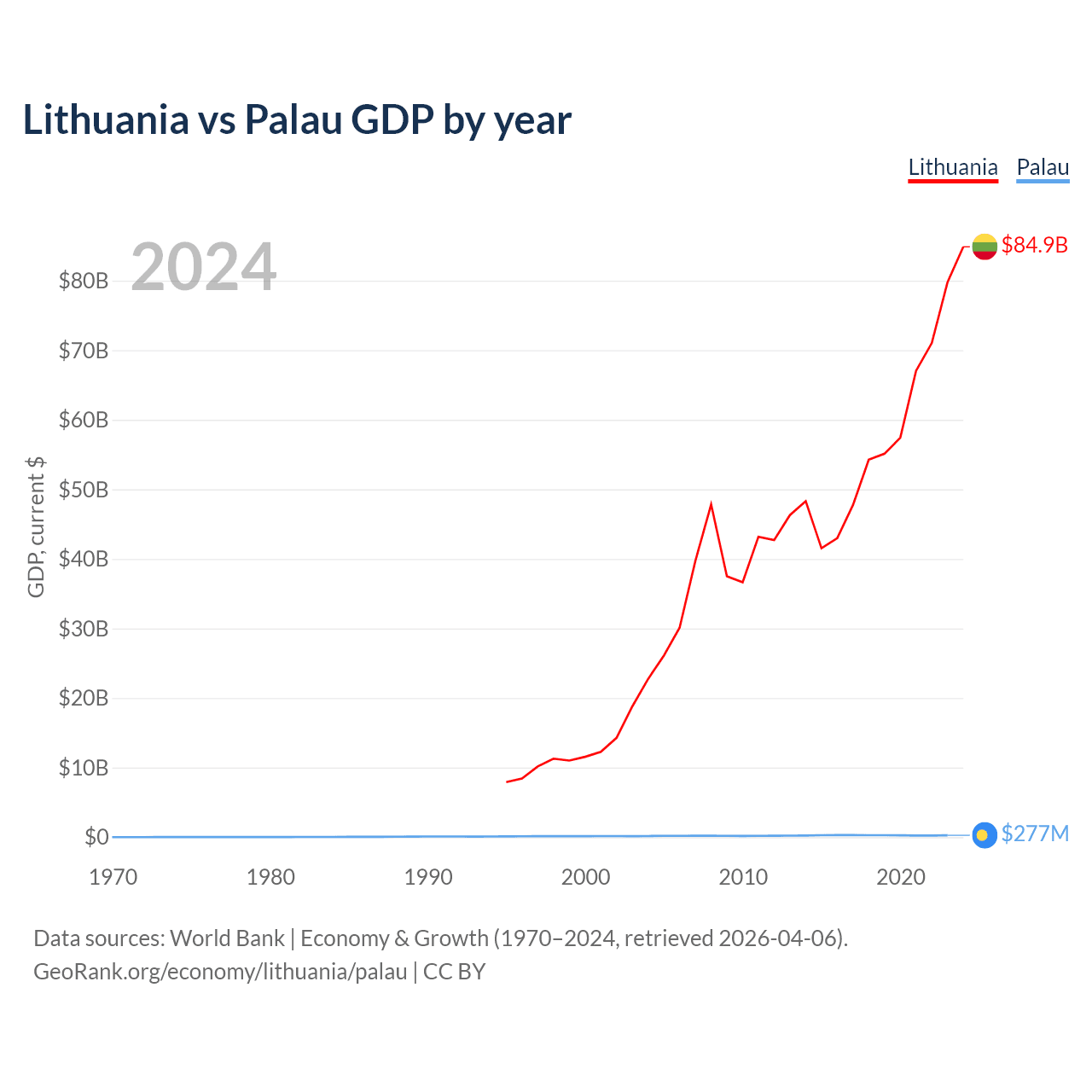 Lithuania has a GDP of $84.9B compared to $277M for Palau, ranking 79/197 and 194/197 by economy size, respectively.