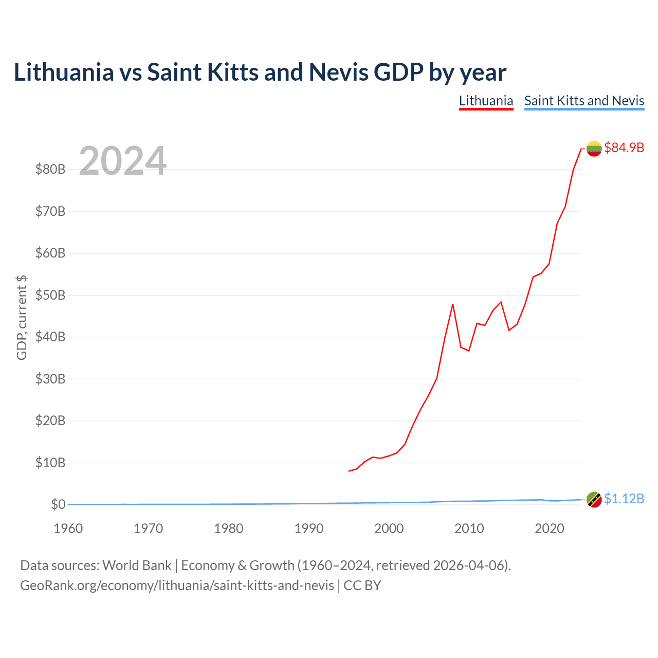 Lithuania has a GDP of $84.9B compared to $1.12B for Saint Kitts and Nevis, ranking 79/197 and 187/197 by economy size, respectively.