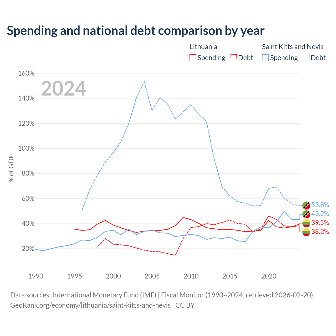 Lithuania has $32.4B in government debt (38.2% of GDP), compared to $604M (53.8% of GDP) in Saint Kitts and Nevis.