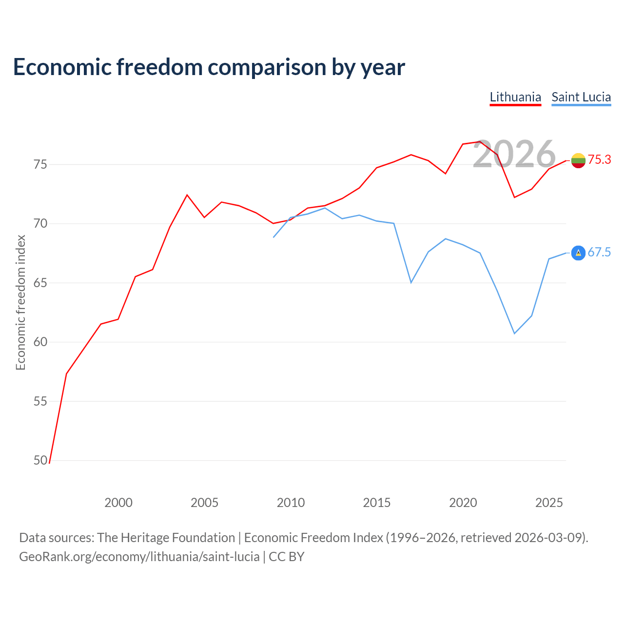 The Economic Freedom Index for Lithuania is 75.3, ranking 18/197, compared to 67.5 for Saint Lucia, ranking 57/197. The chart above displays a comparison of annual changes in economic freedom indexes.