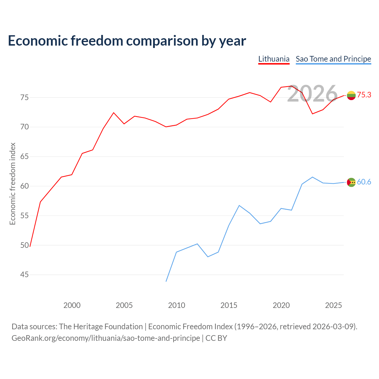 The Economic Freedom Index for Lithuania is 75.3, ranking 18/197, compared to 60.6 for Sao Tome and Principe, ranking 93/197. The chart above displays a comparison of annual changes in economic freedom indexes.