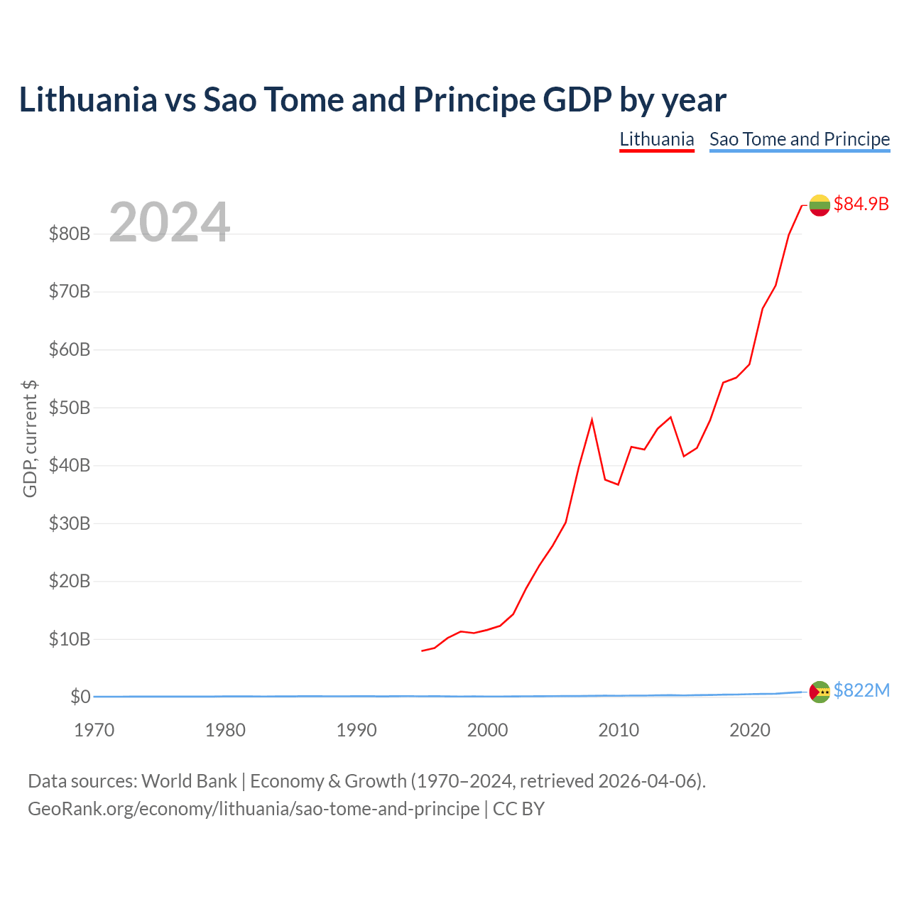 Lithuania has a GDP of $84.9B compared to $822M for Sao Tome and Principe, ranking 79/197 and 189/197 by economy size, respectively.
