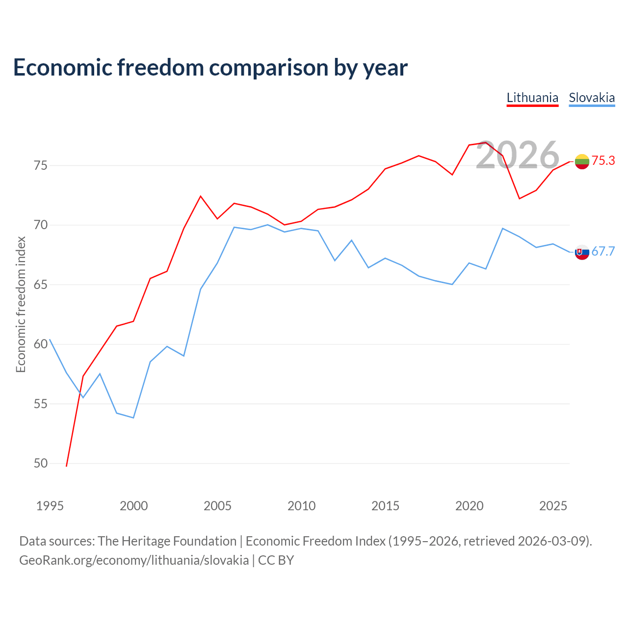 The Economic Freedom Index for Lithuania is 75.3, ranking 18/197, compared to 67.7 for Slovakia, ranking 54/197. The chart above displays a comparison of annual changes in economic freedom indexes.