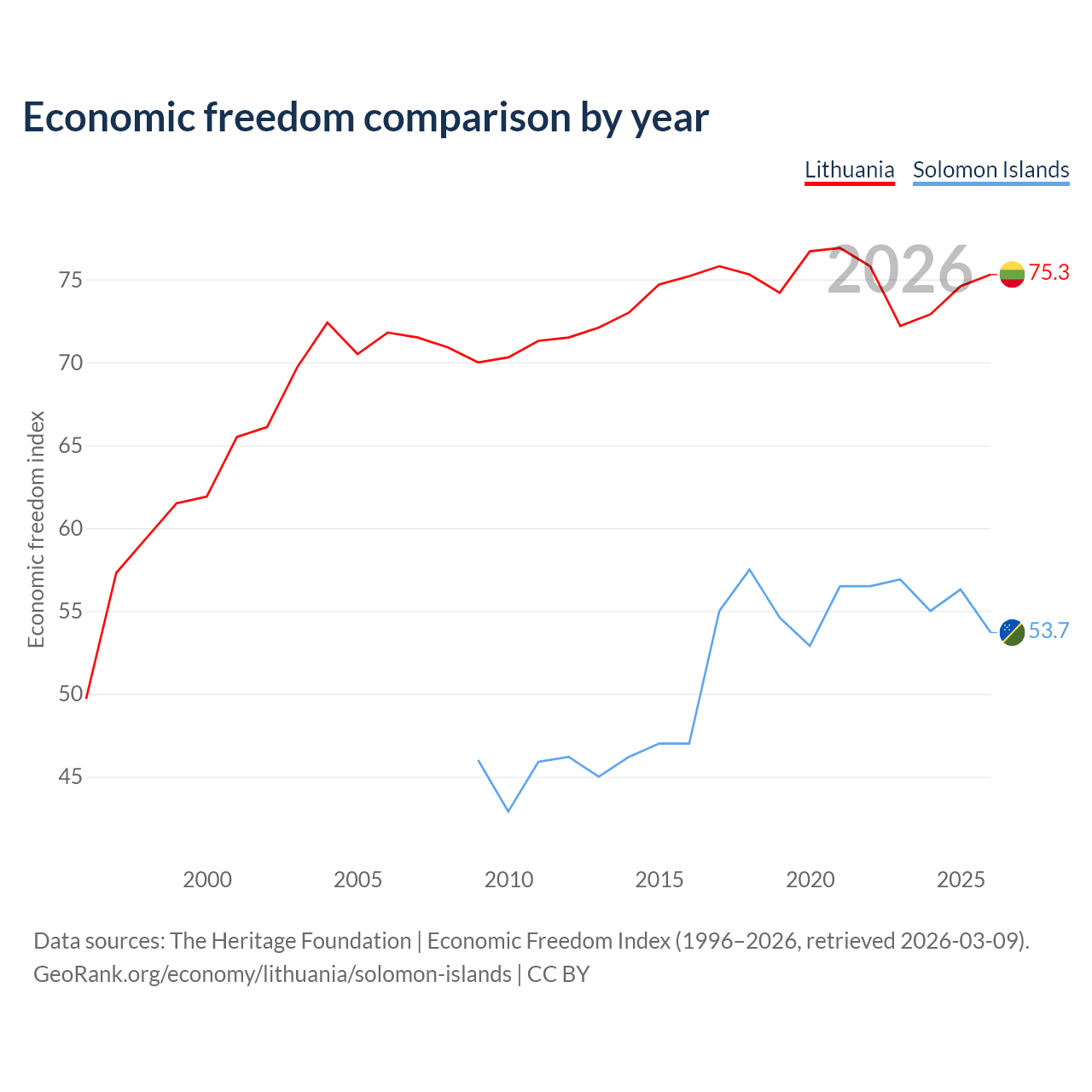 The Economic Freedom Index for Lithuania is 75.3, ranking 18/197, compared to 53.7 for the Solomon Islands, ranking 137/197. The chart above displays a comparison of annual changes in economic freedom indexes.