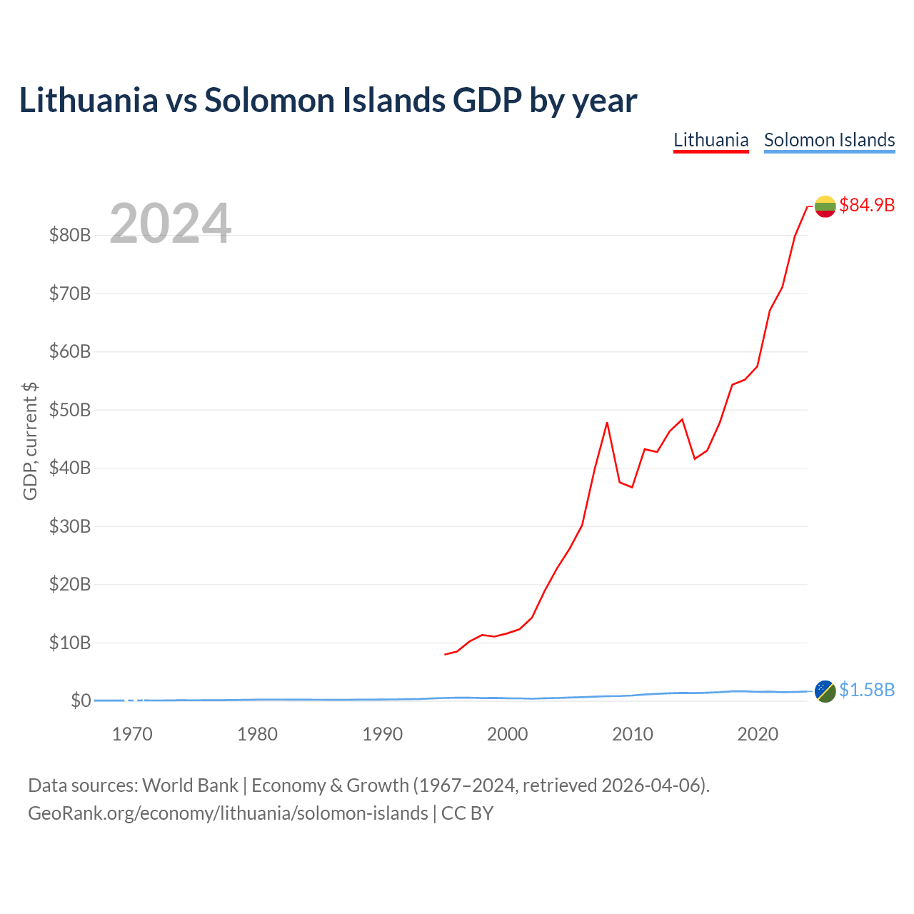 Lithuania has a GDP of $84.9B compared to $1.58B for the Solomon Islands, ranking 79/197 and 182/197 by economy size, respectively.