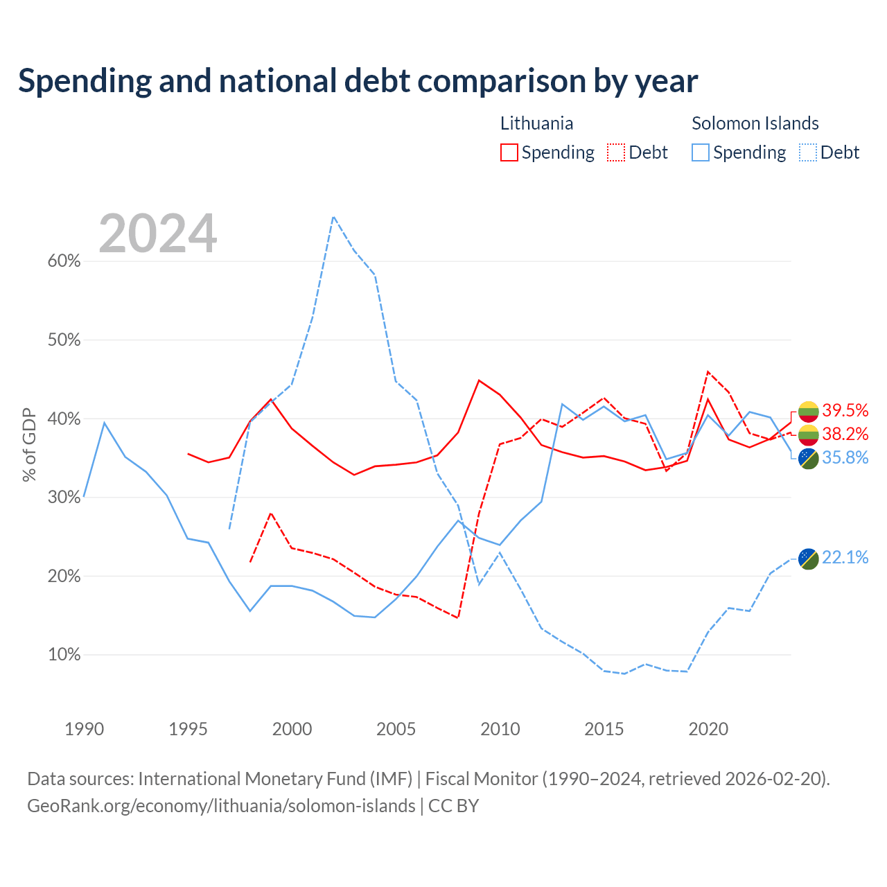 Lithuania has $32.4B in government debt (38.2% of GDP), compared to $350M (22.1% of GDP) in the Solomon Islands.