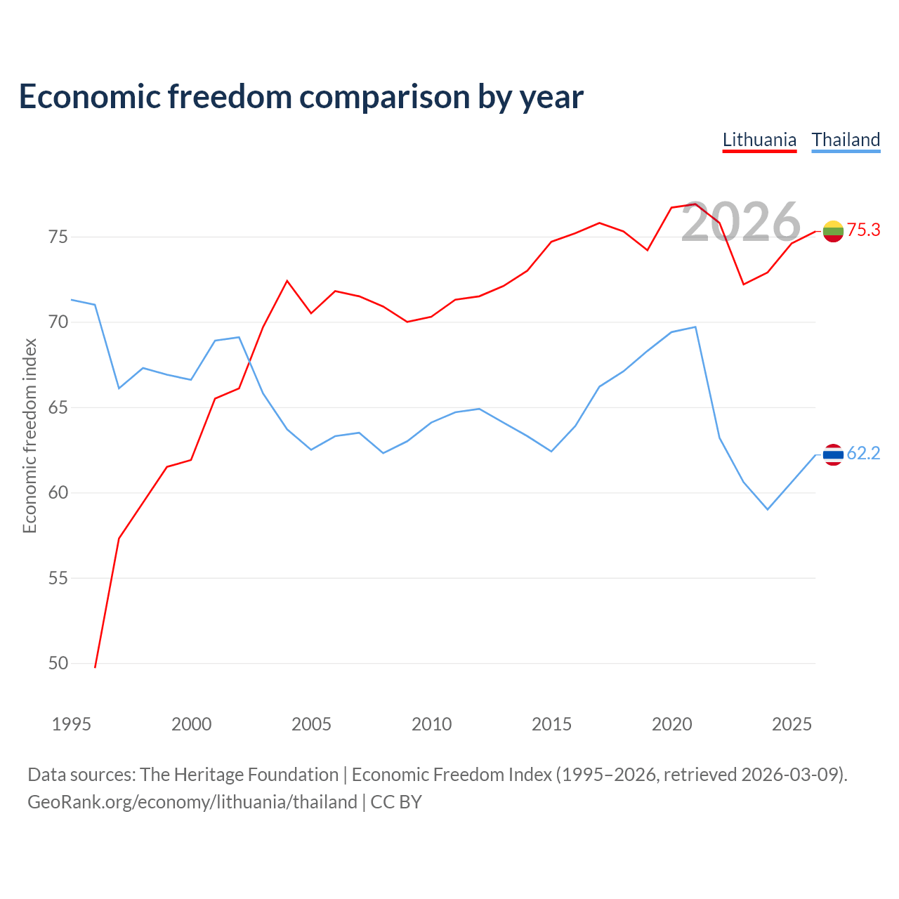 The Economic Freedom Index for Lithuania is 75.3, ranking 18/197, compared to 62.2 for Thailand, ranking 88/197. The chart above displays a comparison of annual changes in economic freedom indexes.