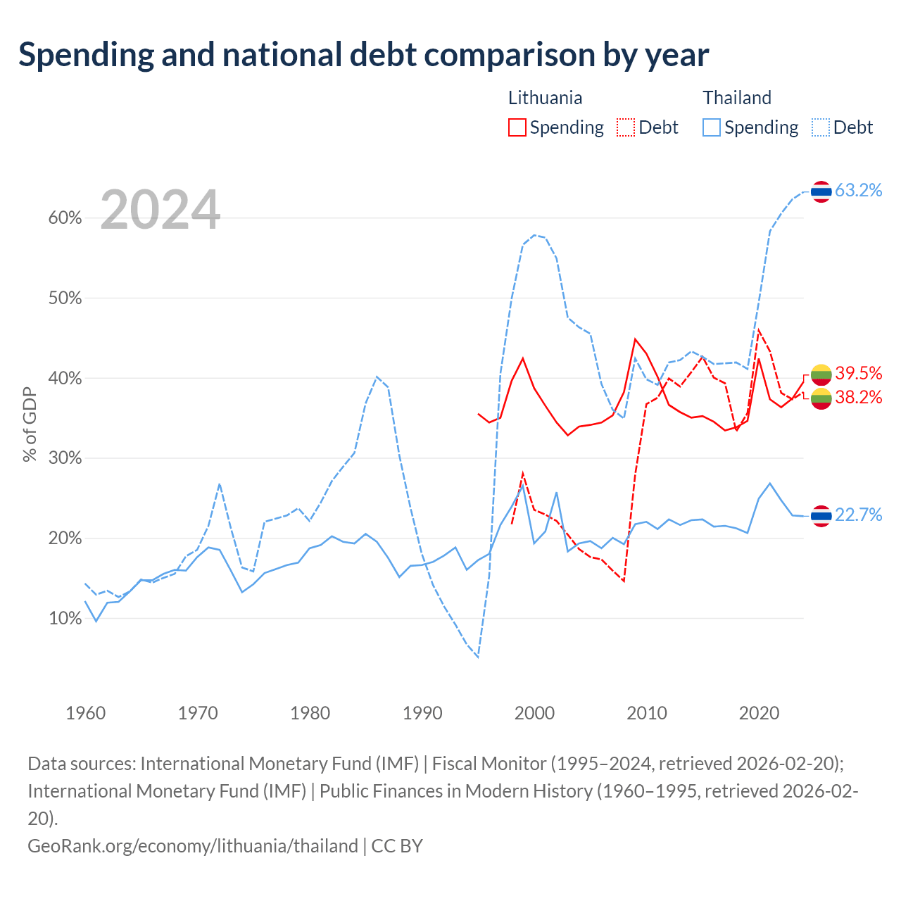 Lithuania has $32.4B in government debt (38.2% of GDP), compared to $333B (63.2% of GDP) in Thailand.