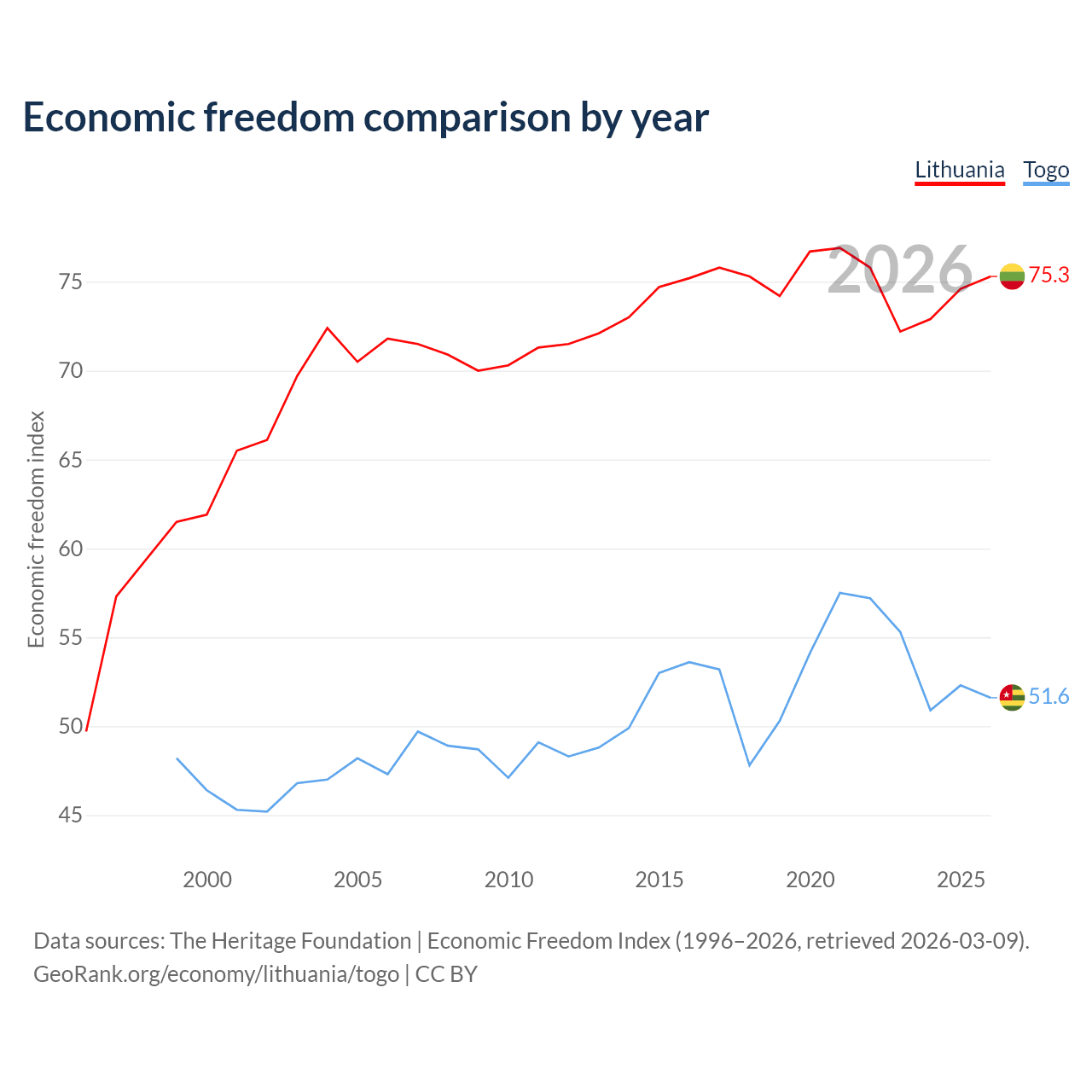 The Economic Freedom Index for Lithuania is 75.3, ranking 18/197, compared to 51.6 for Togo, ranking 153/197. The chart above displays a comparison of annual changes in economic freedom indexes.
