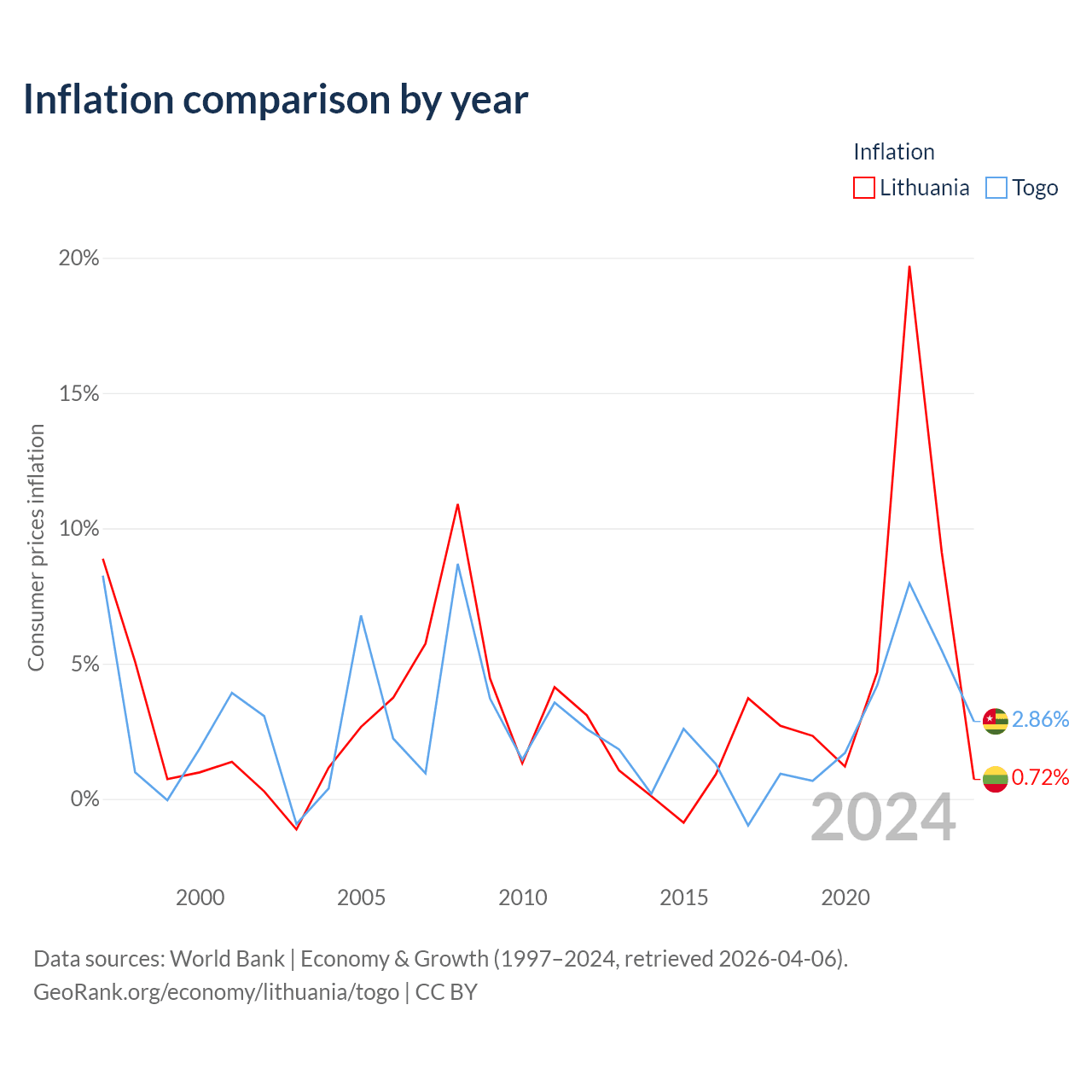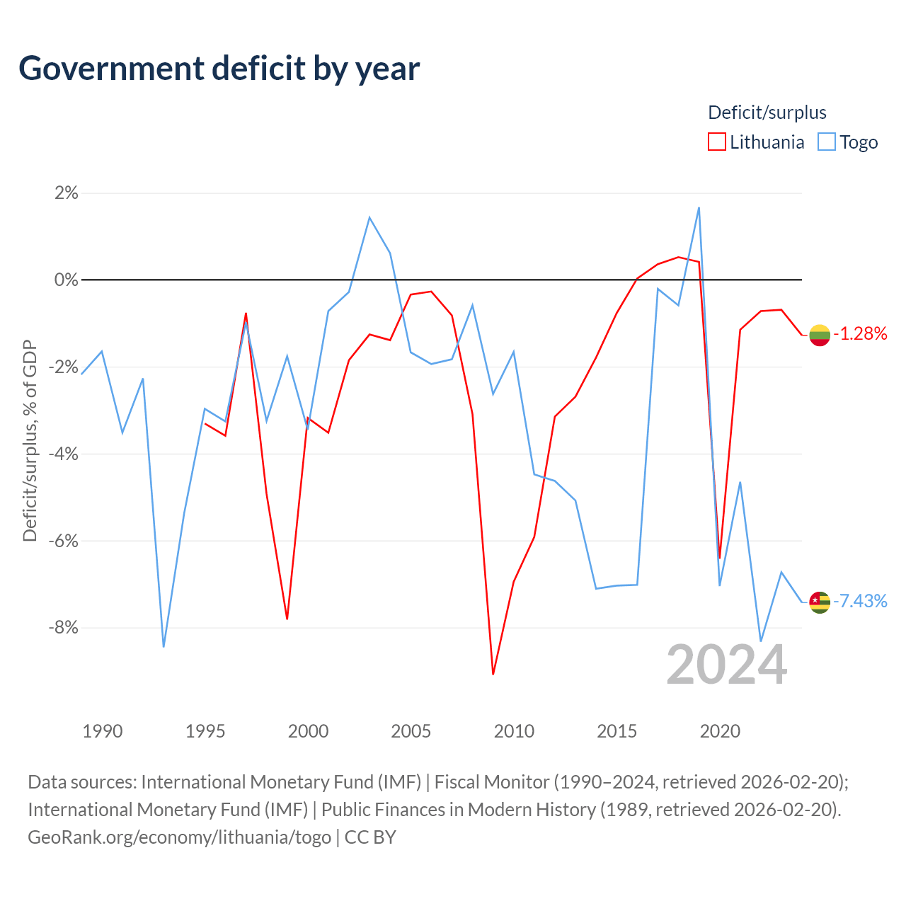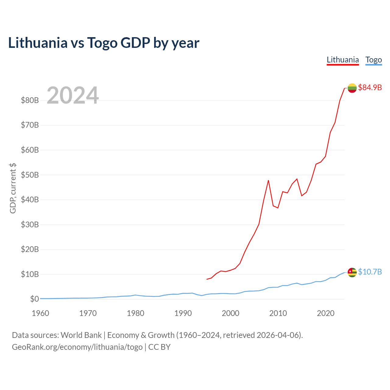 Lithuania has a GDP of $84.9B compared to $10.7B for Togo, ranking 79/197 and 154/197 by economy size, respectively.