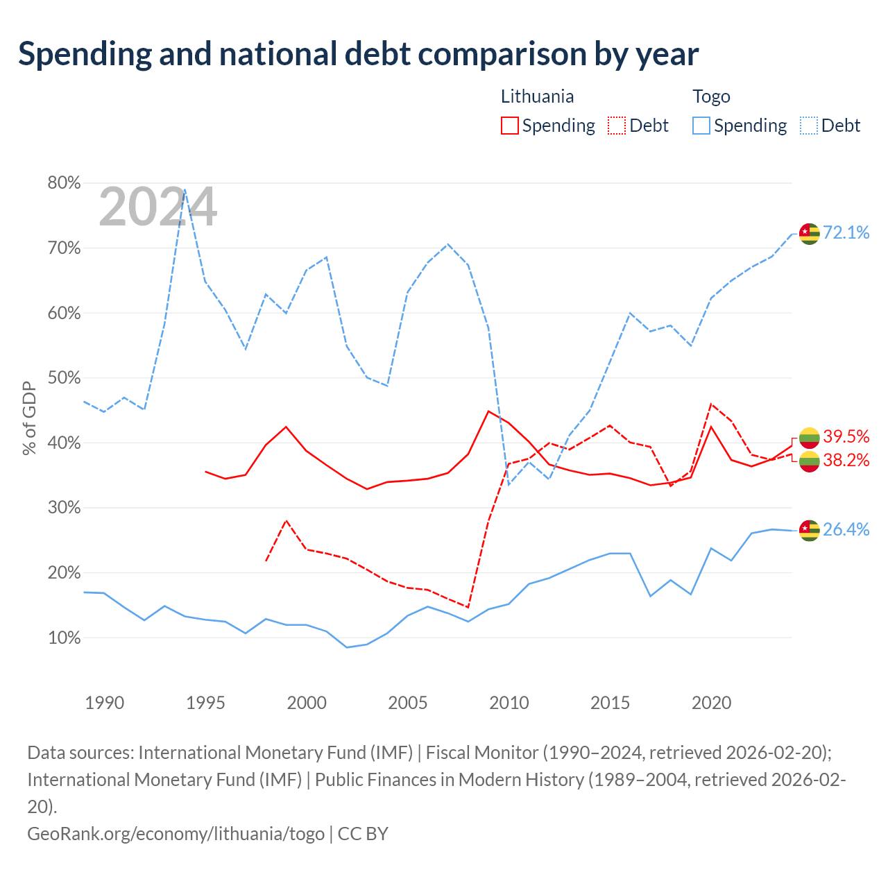 Lithuania has $32.4B in government debt (38.2% of GDP), compared to $7.68B (72.1% of GDP) in Togo.