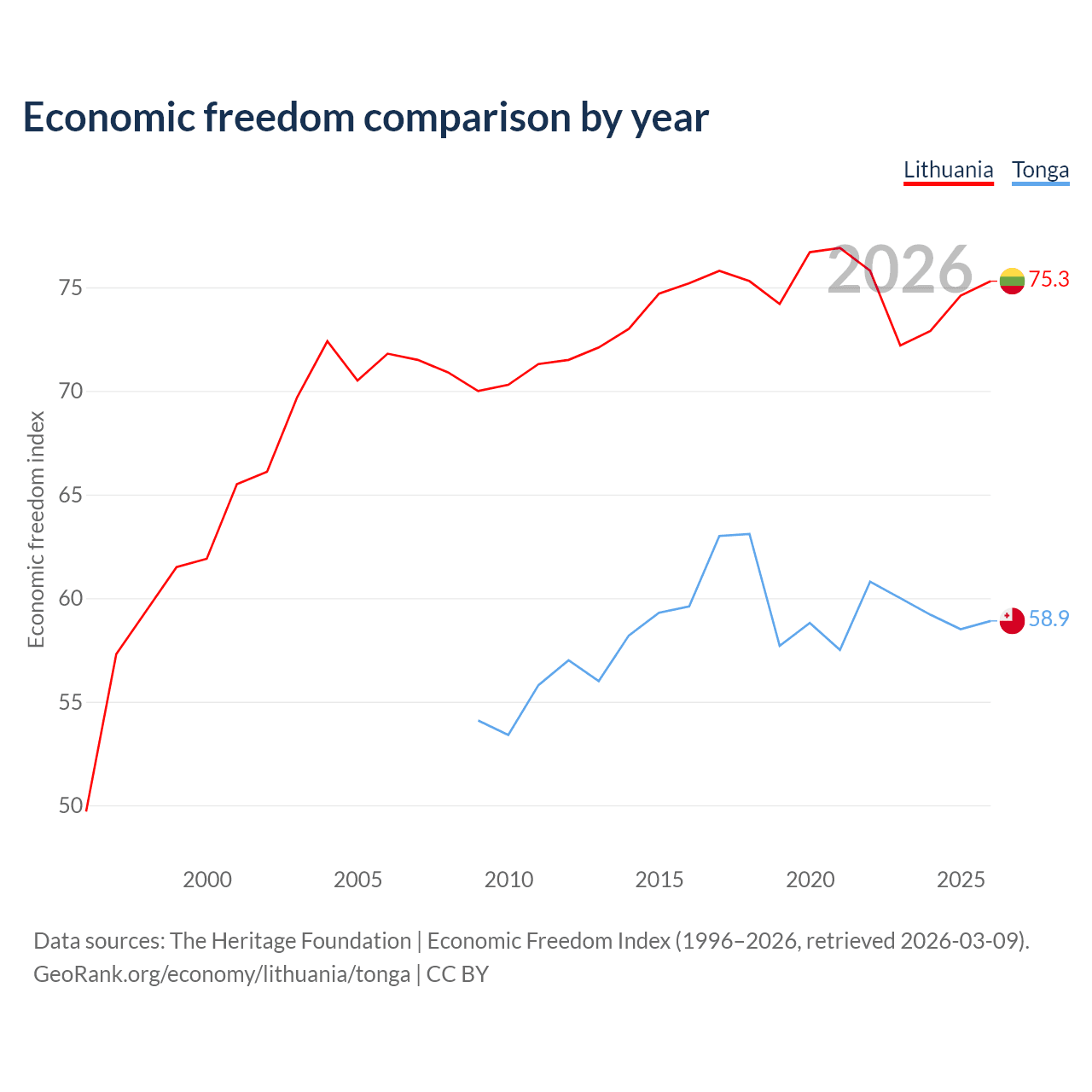 The Economic Freedom Index for Lithuania is 75.3, ranking 18/197, compared to 58.9 for Tonga, ranking 107/197. The chart above displays a comparison of annual changes in economic freedom indexes.