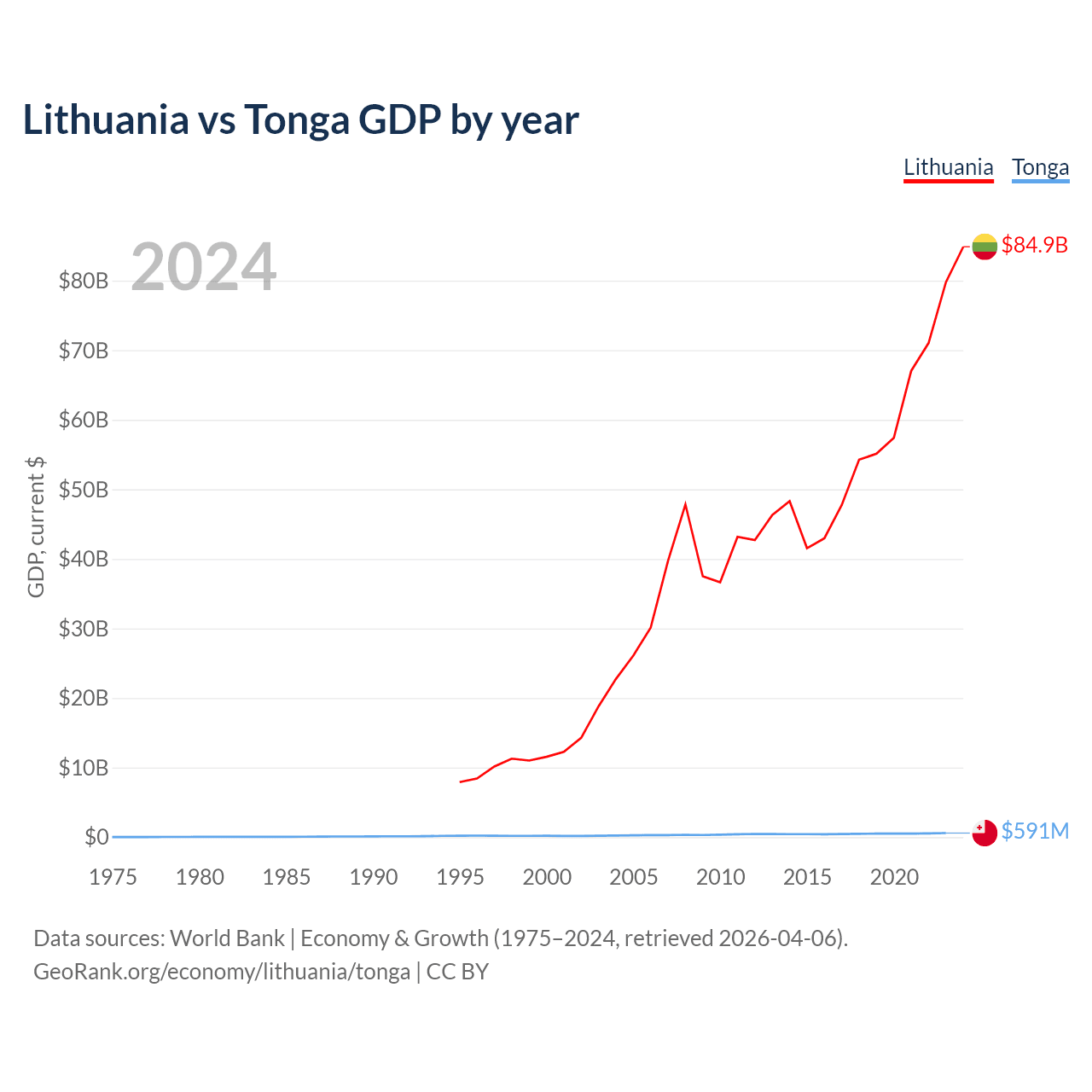 Lithuania has a GDP of $84.9B compared to $591M for Tonga, ranking 79/197 and 191/197 by economy size, respectively.