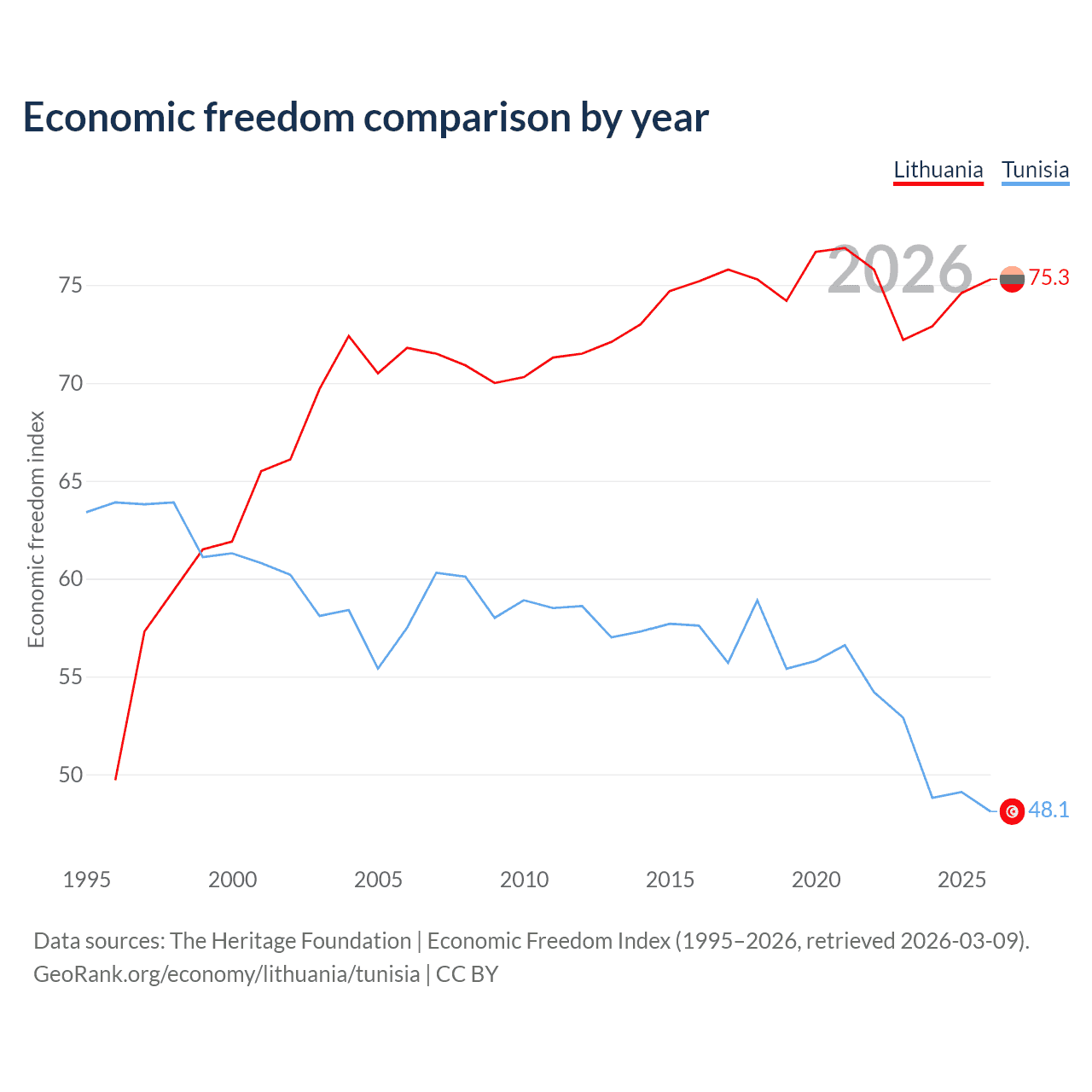 The Economic Freedom Index for Lithuania is 75.3, ranking 18/197, compared to 48.1 for Tunisia, ranking 172/197. The chart above displays a comparison of annual changes in economic freedom indexes.