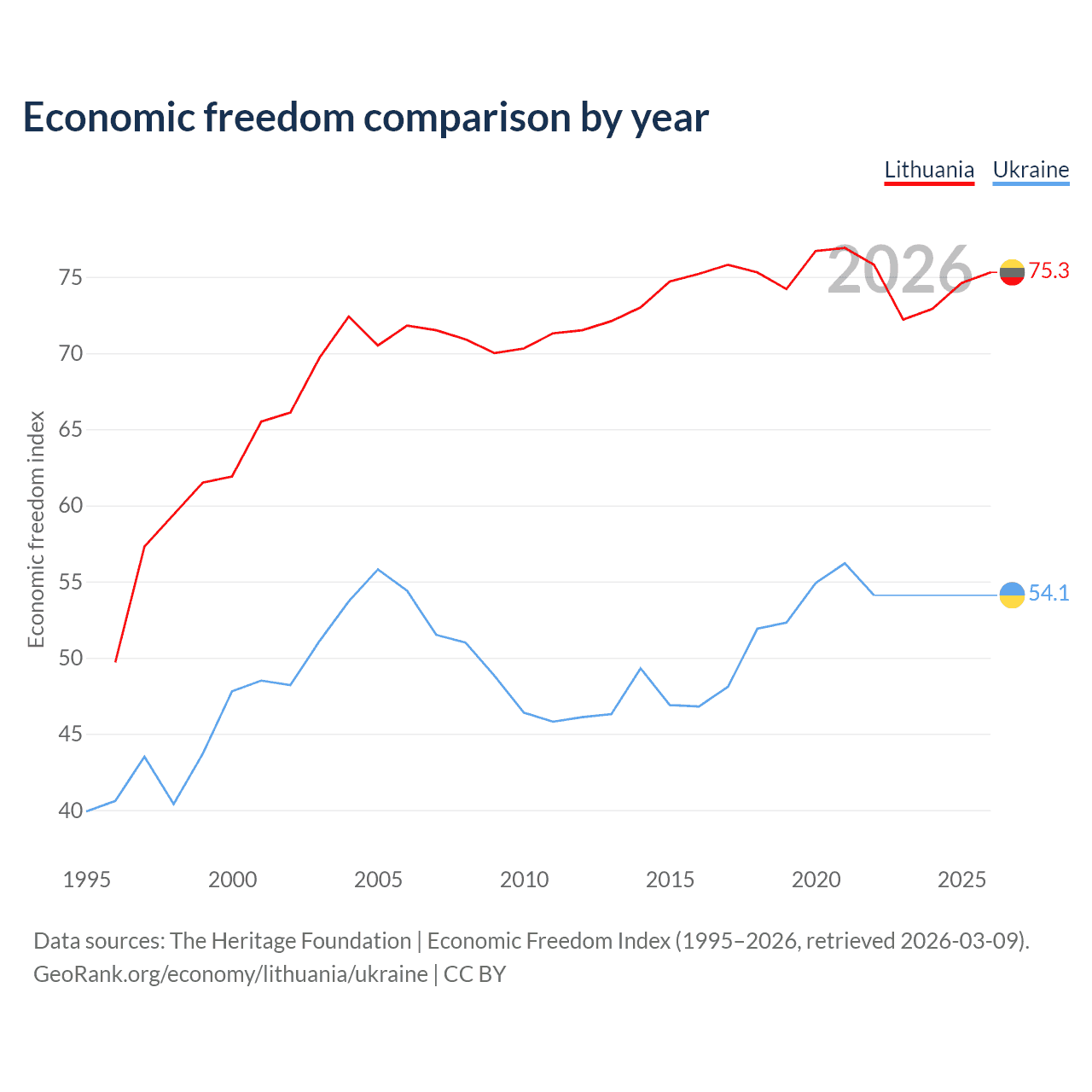 The Economic Freedom Index for Lithuania is 75.3, ranking 18/197, compared to 54.1 for Ukraine, ranking 135/197. The chart above displays a comparison of annual changes in economic freedom indexes.