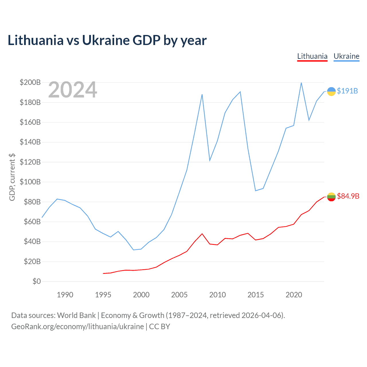 Lithuania has a GDP of $84.9B compared to $191B for Ukraine, ranking 79/197 and 57/197 by economy size, respectively.