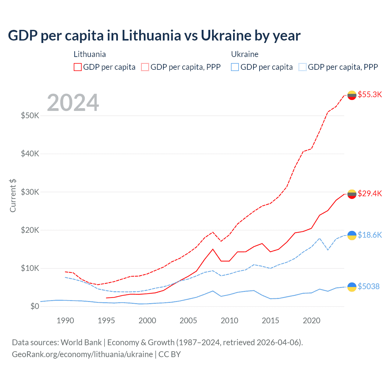 Lithuania's GDP per capita is $29,384, ranking 43/197, compared to $5,038 in Ukraine, ranking 120/197. Adjusted for purchasing power (GDP per capita PPP), Lithuania ranks 39th at $55,286, while Ukraine ranks 101st at $18,550.